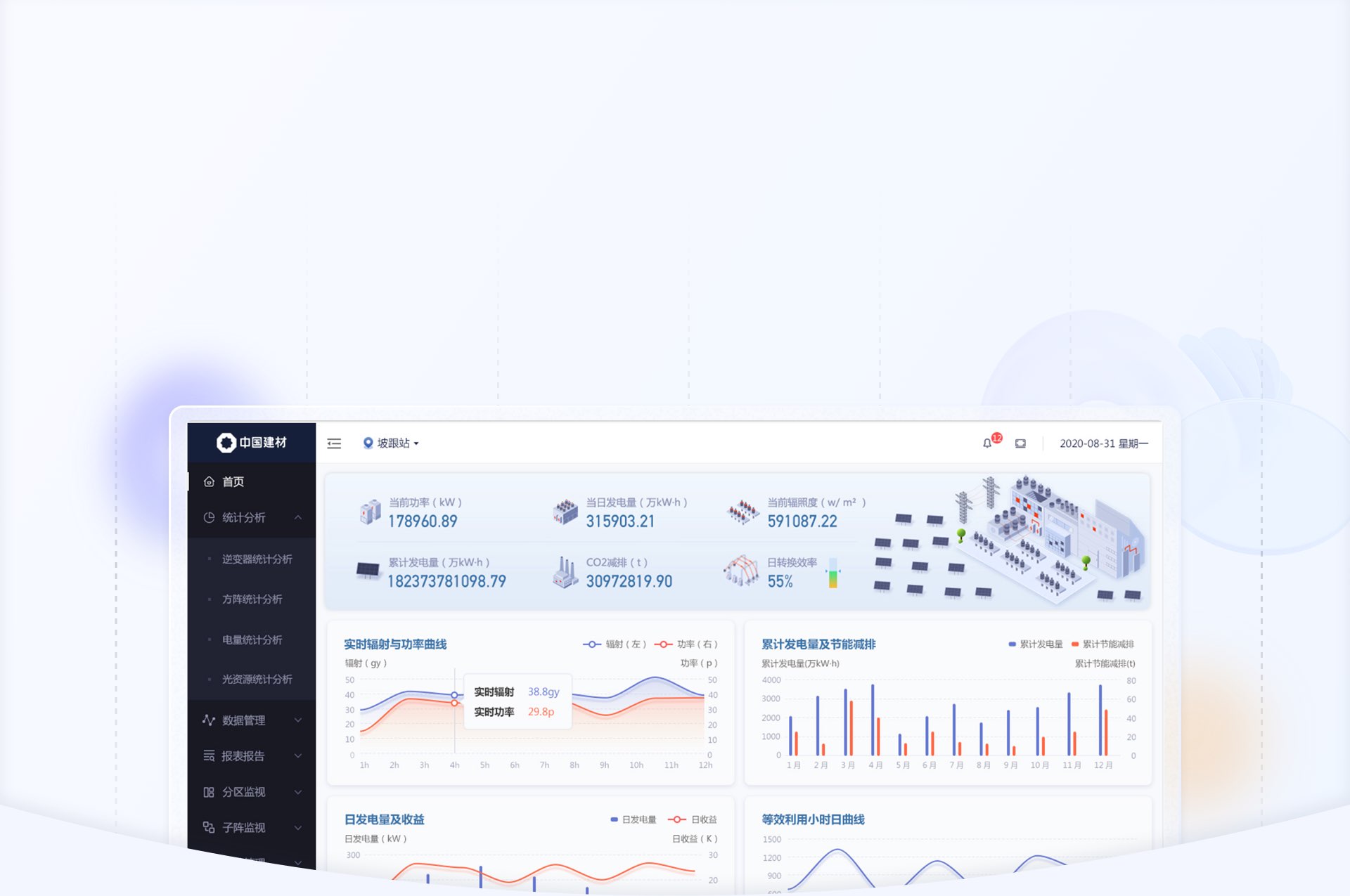 設計前期,藍藍設計通過問卷調(diào)查方式確定客戶風格和喜好,并和客戶溝通頁面交互邏輯和優(yōu)化方法,確定交互方式后,再進入視覺設計階段,這樣可以快速確定設計方向,節(jié)省大量時間。視覺設計方面,藍藍設計嘗試將2.5d圖標融入界面設計中,通過立體化,場景化的圖標,更加直觀地展示出產(chǎn)品功能屬性和使用場景,為光伏電站UI設計方向提供藍藍的設計方案。
