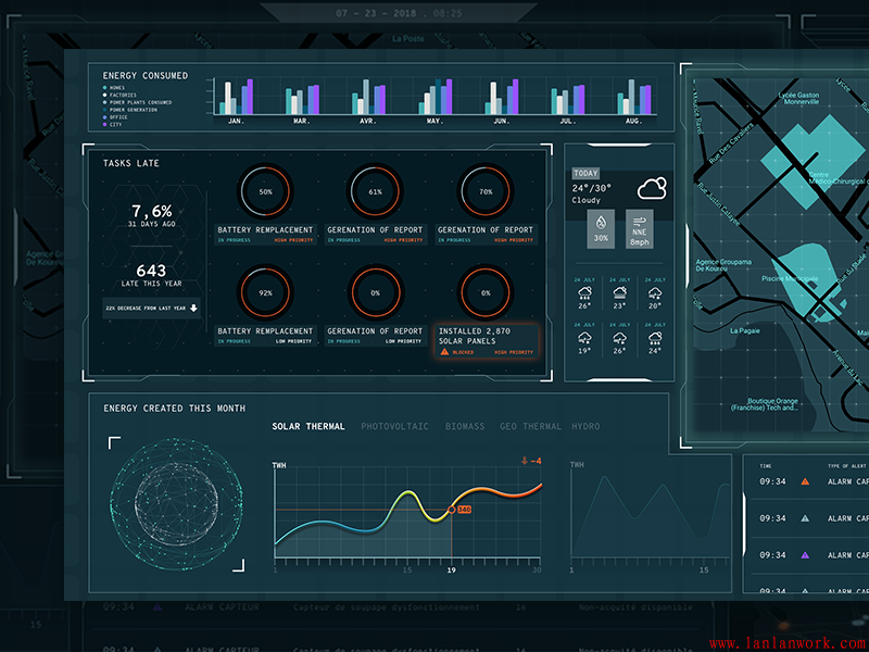 大屏可視化界面設計可謂是當今行業、企業發展的見證,生動直觀地再現了行業、企業的全貌。不僅作為展示,方便了解、監督;同時可以作為一個有效的管理平臺,帶來效益。大屏界面面向范圍廣,協同性好,易于被采用。下面幾個大屏的界面設計,沉穩的背景上,加上亮色作為點綴和強調。既不失其風格,又富有靈動性。
