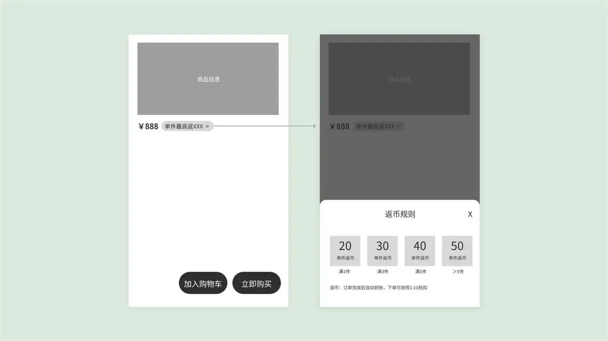乍一看該功能都不需要設計師參與,只需要根據商品的返虛擬幣規則,將之前的單件反幣標識改成多個就行,如“1 件返 XX、3 件返 XX…”,雖然看起來好像也解決了業務訴求,但是如果僅僅考慮標識展示,而不結合需求背后的業務邏輯去思考,后續也會隨著規則的變化而帶來對應的問題,那對于交互與UI設計師而言,針對這個需求,又該如何考慮的呢?我將分為“交互篇”與“UI篇”來分別闡述。