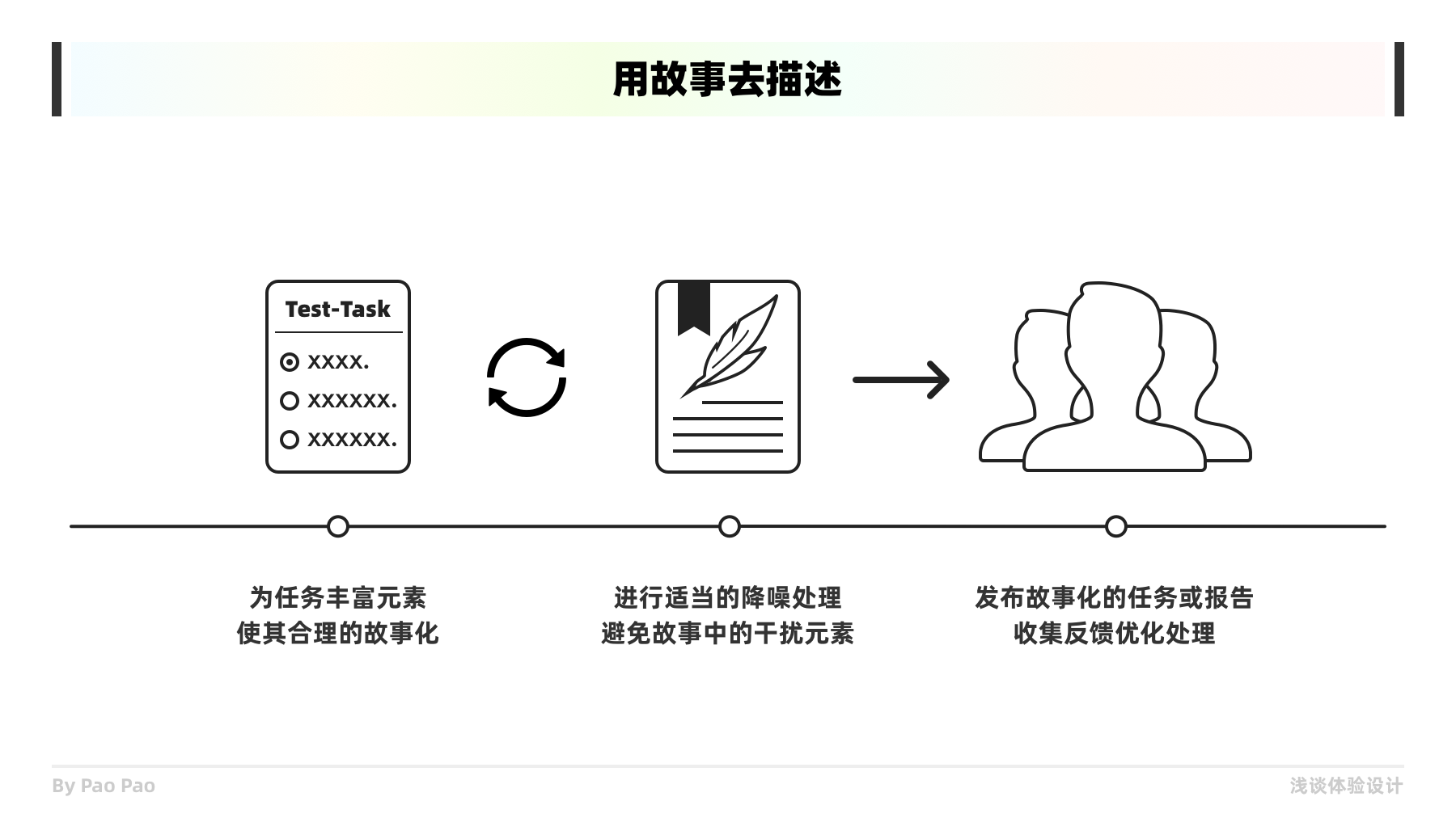 故事的元素通常會更豐富更有趣味,用故事敘事更能提升用戶的興趣和關注,這能便于構建共情。因此當你發布測試任務或者撰寫研究報告時,都可以加入背景故事或用故事敘事,便于對象更容易理解和共情,你甚至可以用筆繪制故事版,像四格漫畫一般,因為用圖傳達概念或信息更容易讓人記住或回想起來,并且當你用這些方法時,自身也能加強理解。共情不是單向傳遞的,不要高估對方的理解能力,讓你的信息更簡單明了的傳遞也是重要的共情應用!