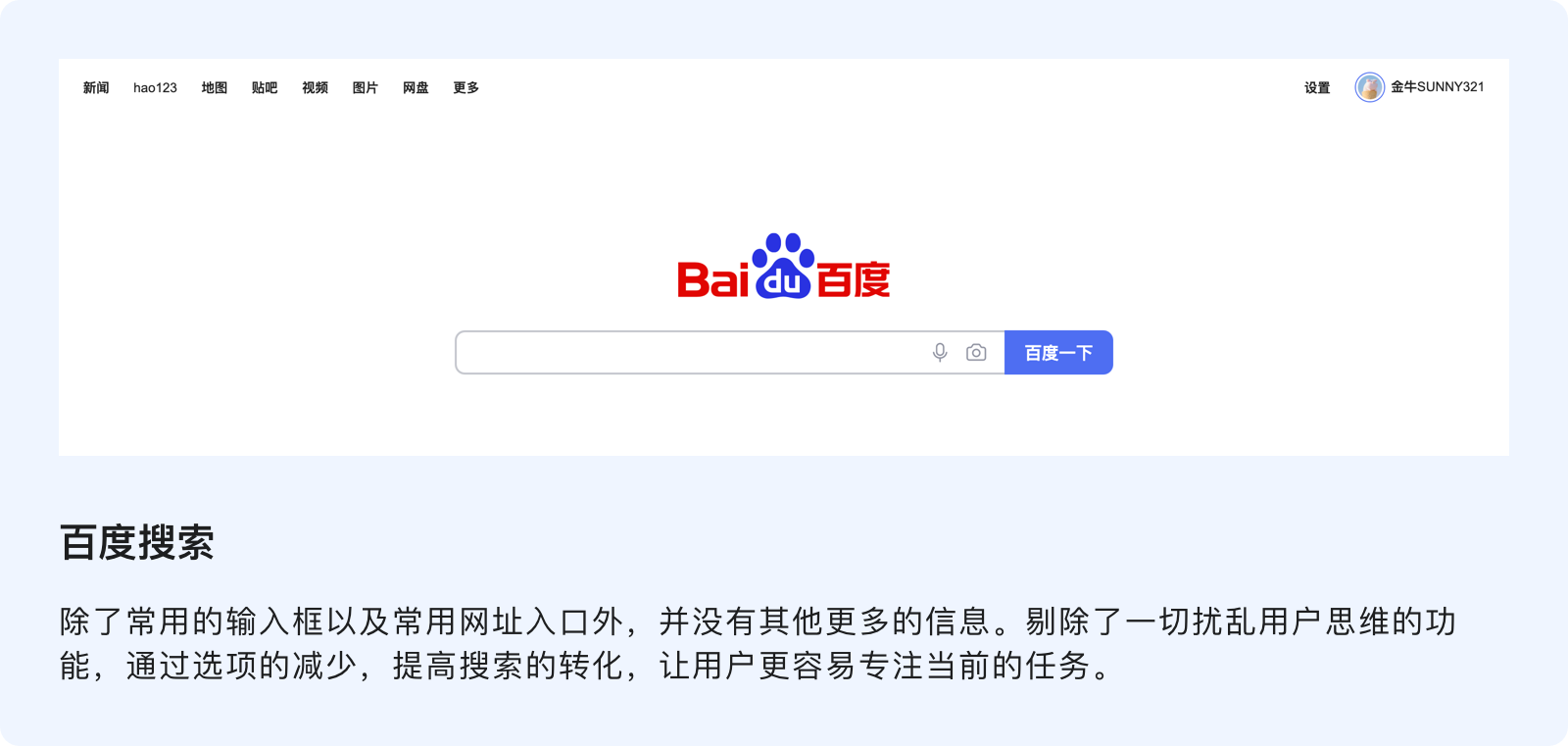 網(wǎng)頁(yè)通過(guò)大面積的留白營(yíng)造平和感,通過(guò)高反差的對(duì)比創(chuàng)造視覺(jué)焦點(diǎn),將必要的信息烘托出來(lái),然后借助留白包圍它們。通過(guò)這種方式把核心信息凸顯出來(lái),當(dāng)用戶進(jìn)入該搜索頁(yè)時(shí),只做必要的事情,關(guān)注重要的信息。