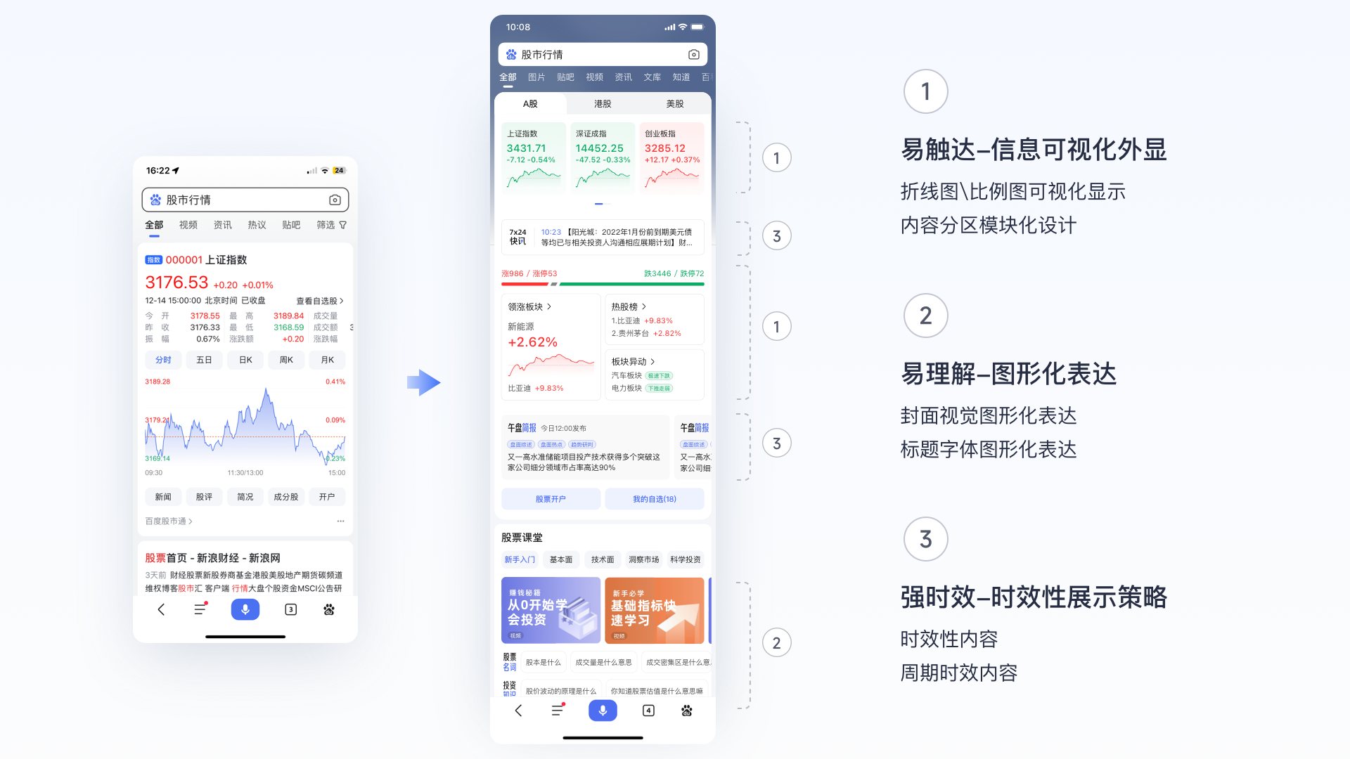 基于小白用戶經驗少、金融垂類專業知識多晦澀難懂、數據復雜難理解的背景,制定易觸達、易理解2個策略,通過信息可視化外顯、圖表圖形化表達、關鍵信息外顯等方式降低用戶消費門檻,提高信息獲取效率,強時效是基于股票特有的盤前/盤中/盤后周期性交易特征擬定的,可通過此特征打造更加差異化的滿足。