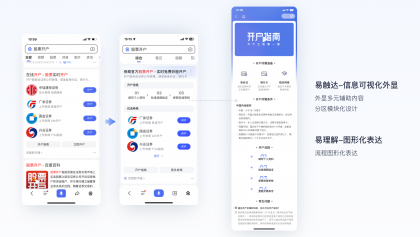 策略設計 :結合用戶需求優先級對信息模塊進行分區,可視化外顯優先滿足開戶流程需求,再提供優質券商開戶入口,考慮到搜索結果頁卡片展示屏效,完整開戶指南配合在落地頁內呈現。