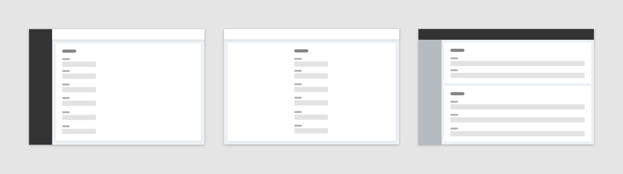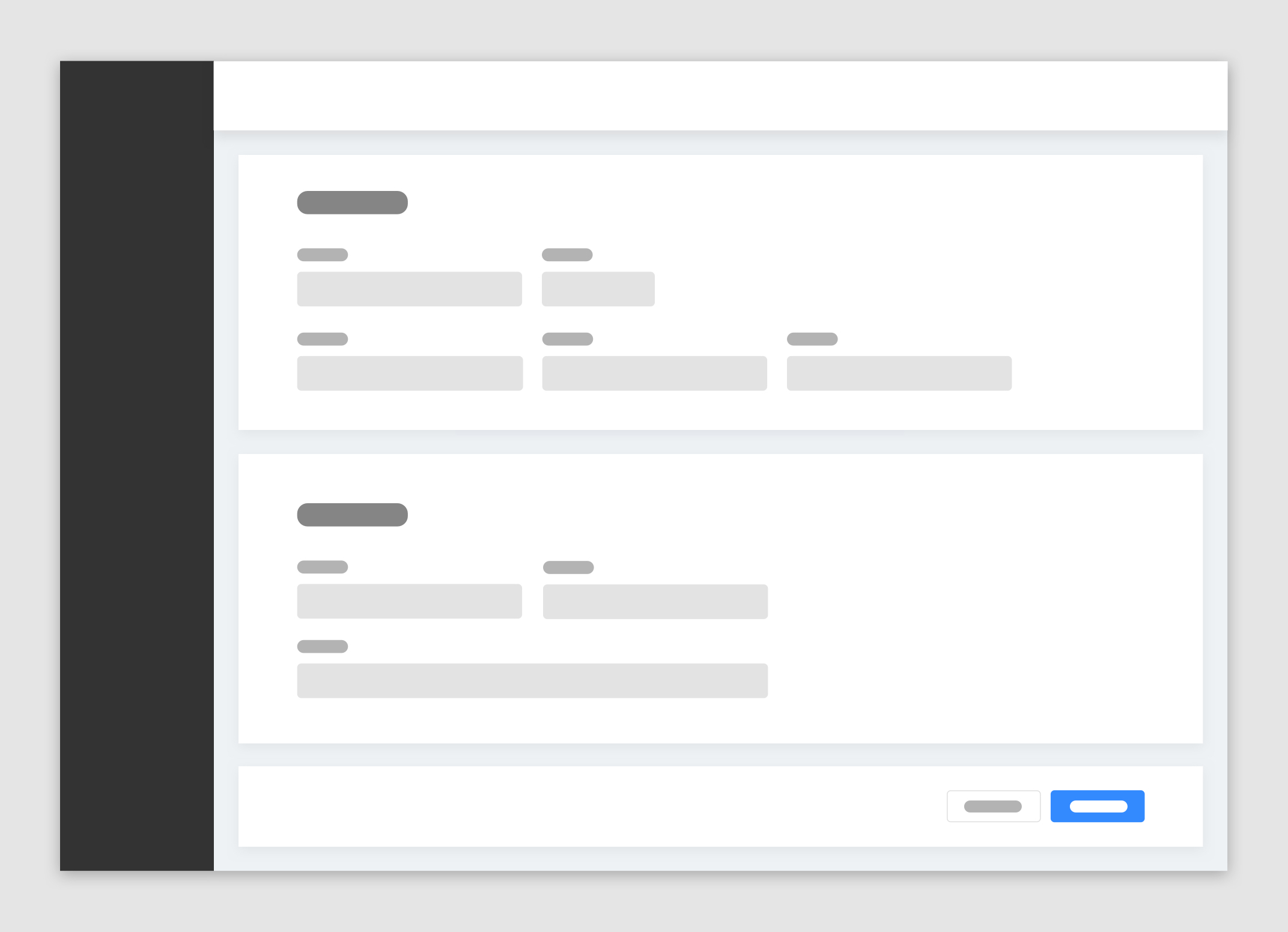 卡片分組布局一般用來(lái)處理高復(fù)雜類(lèi)型表單。當(dāng)業(yè)務(wù)中希望頁(yè)面承載眾多表單字段時(shí),可將信息相關(guān)性弱的字段拆分為多個(gè)部分,并通過(guò)多個(gè)卡片分組承載不同類(lèi)型字段,每個(gè)卡片都需有個(gè)卡片類(lèi)別標(biāo)題。