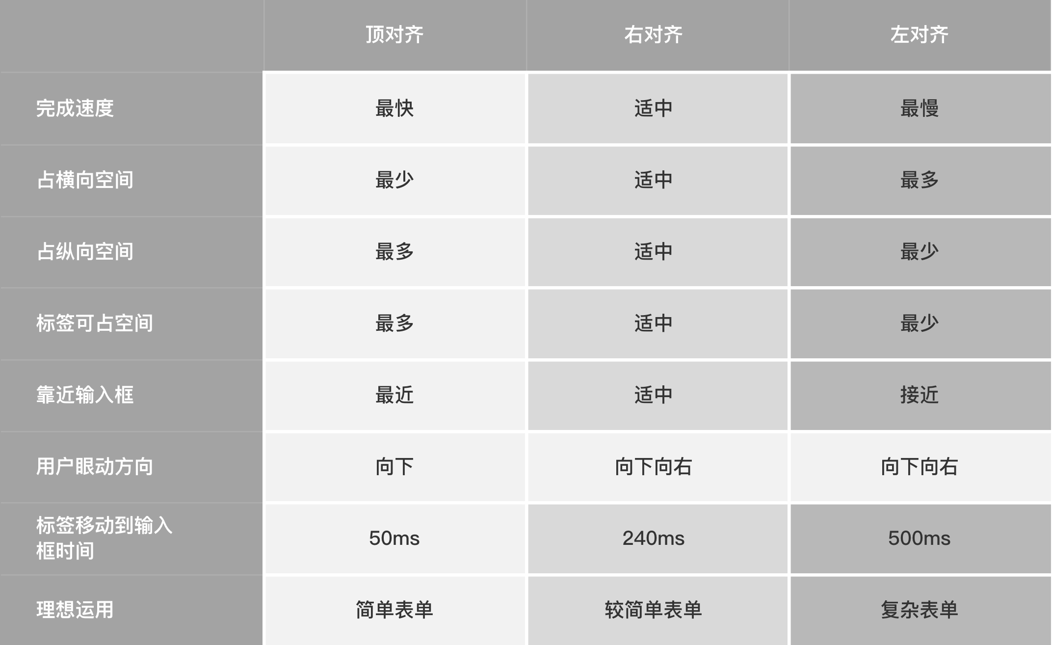 在設(shè)計(jì)表單時(shí)到底是左對(duì)齊、右對(duì)齊還是頂部對(duì)齊呢?這個(gè)問(wèn)題也是在實(shí)際業(yè)務(wù)中設(shè)計(jì)師發(fā)問(wèn)頻率較高的一個(gè)棘手問(wèn)題。其實(shí),不論是哪種方式都有相對(duì)的利弊,需要根據(jù)實(shí)際業(yè)務(wù)場(chǎng)景提供不同的解決方案。在Matteo Penzo《Label Placement in Forms》文章中有分享過(guò)關(guān)于表單標(biāo)簽放置的研究,下圖是Matteo Penzo研究總結(jié)得到的瀏覽時(shí)間表: