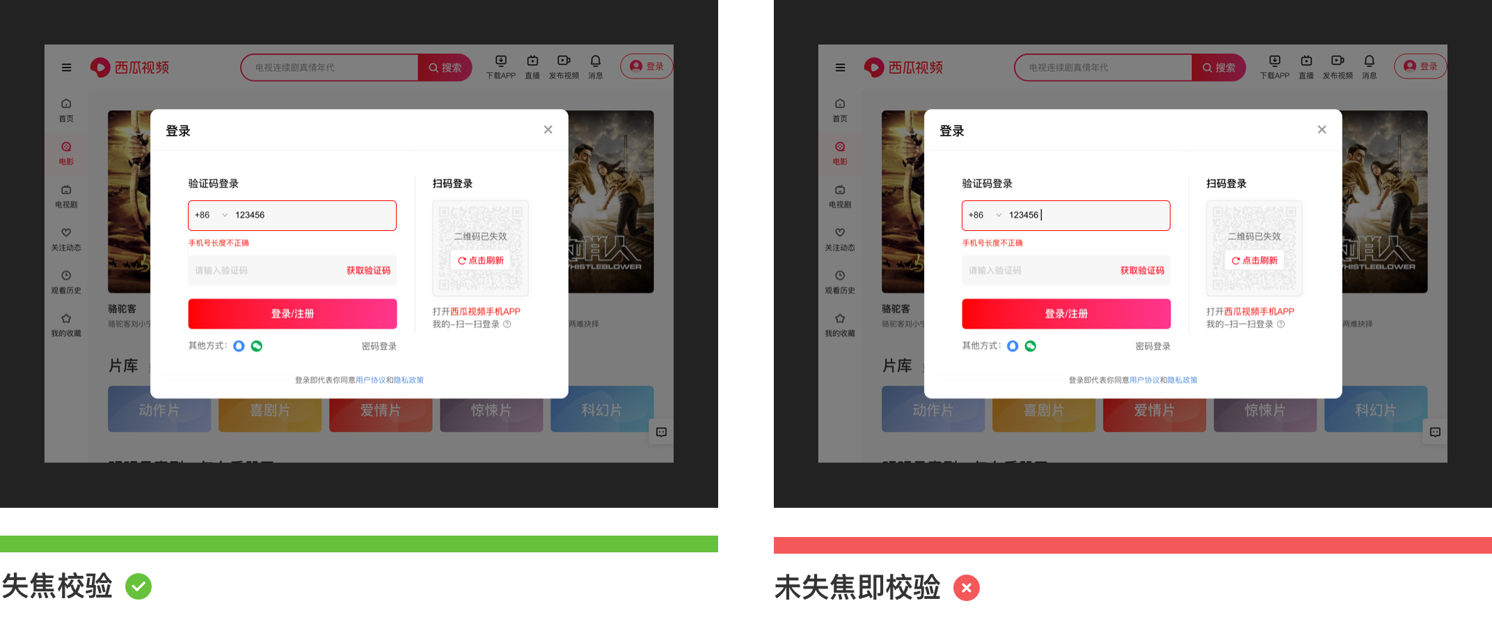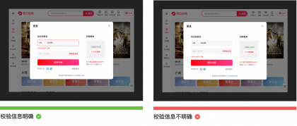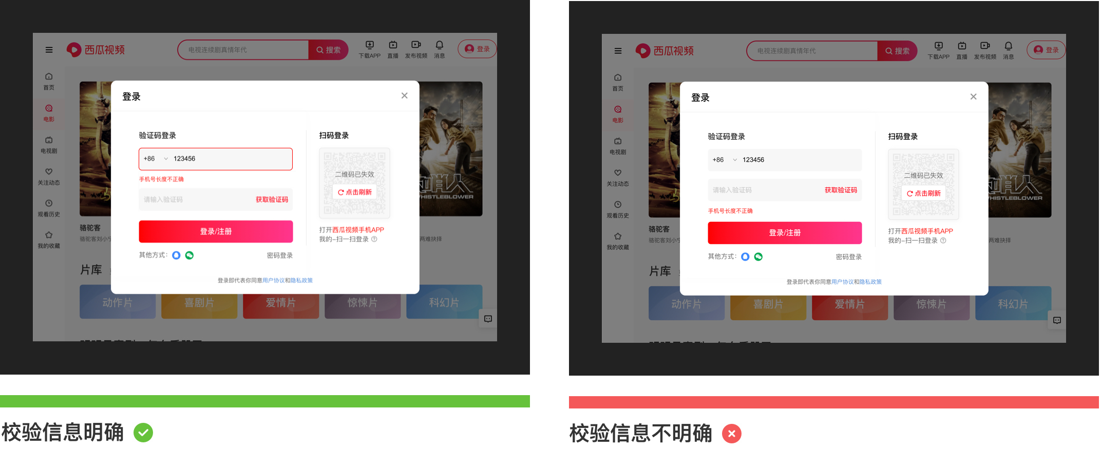 錯(cuò)誤校驗(yàn)提示一般存在于錯(cuò)誤率較高情況下出現(xiàn),如:在登錄注冊(cè)時(shí),要求用戶(hù)填寫(xiě)手機(jī)號(hào),如果用戶(hù)輸入的手機(jī)號(hào)碼不符合特定的輸入格式,那么這時(shí)候需要明確標(biāo)記錯(cuò)誤原因,準(zhǔn)確的幫助用戶(hù)找到問(wèn)題并解決,避免錯(cuò)誤提示描述模糊不清誤導(dǎo)用戶(hù)。錯(cuò)誤提示一般會(huì)采用“雙重視覺(jué)強(qiáng)調(diào)”來(lái)顯示錯(cuò)誤,除了輸入框突出顯示外,同時(shí)需要在輸入框下方加入紅色指導(dǎo)文字。如下圖所示為西瓜視頻登錄注冊(cè)場(chǎng)景下的截圖: