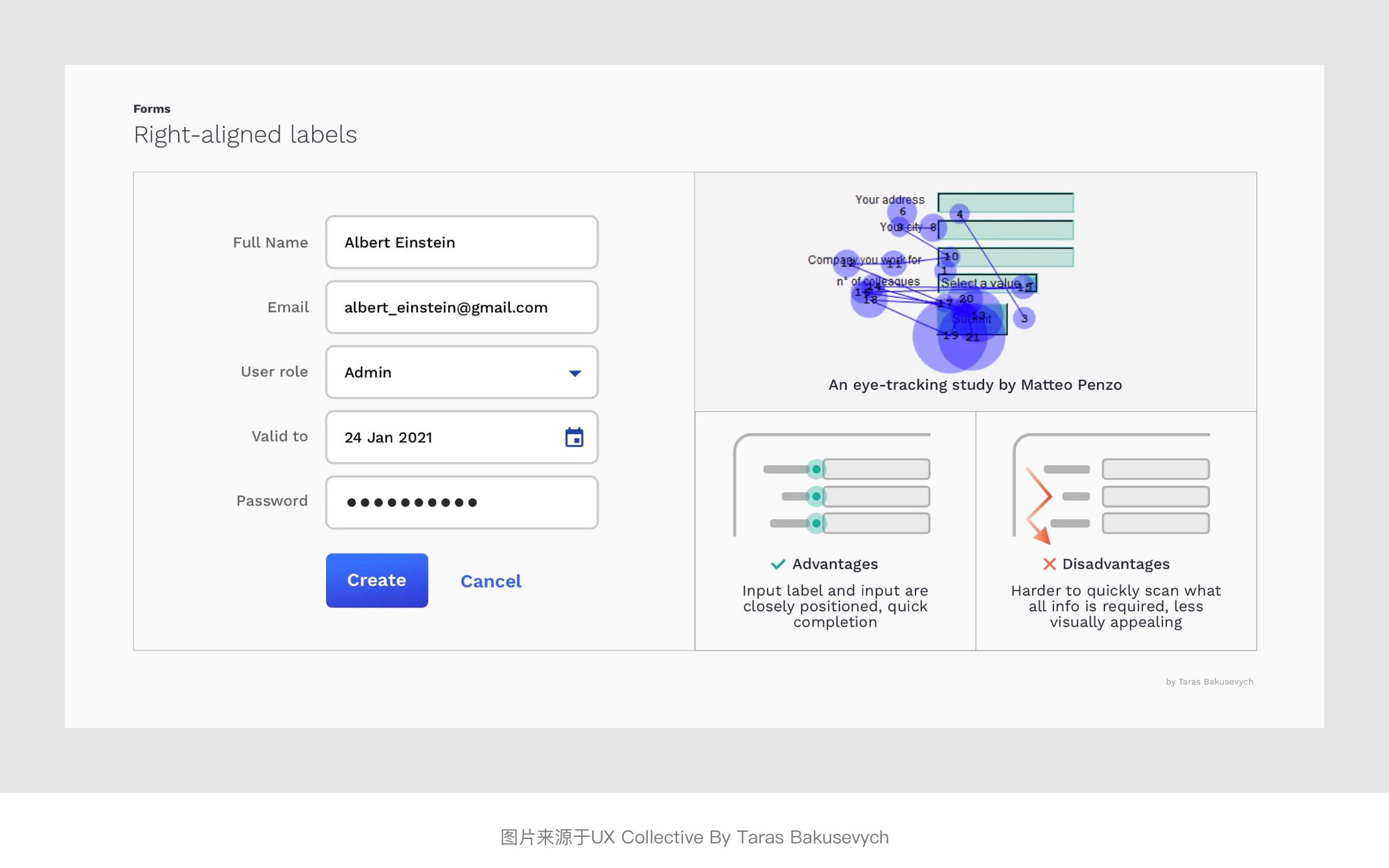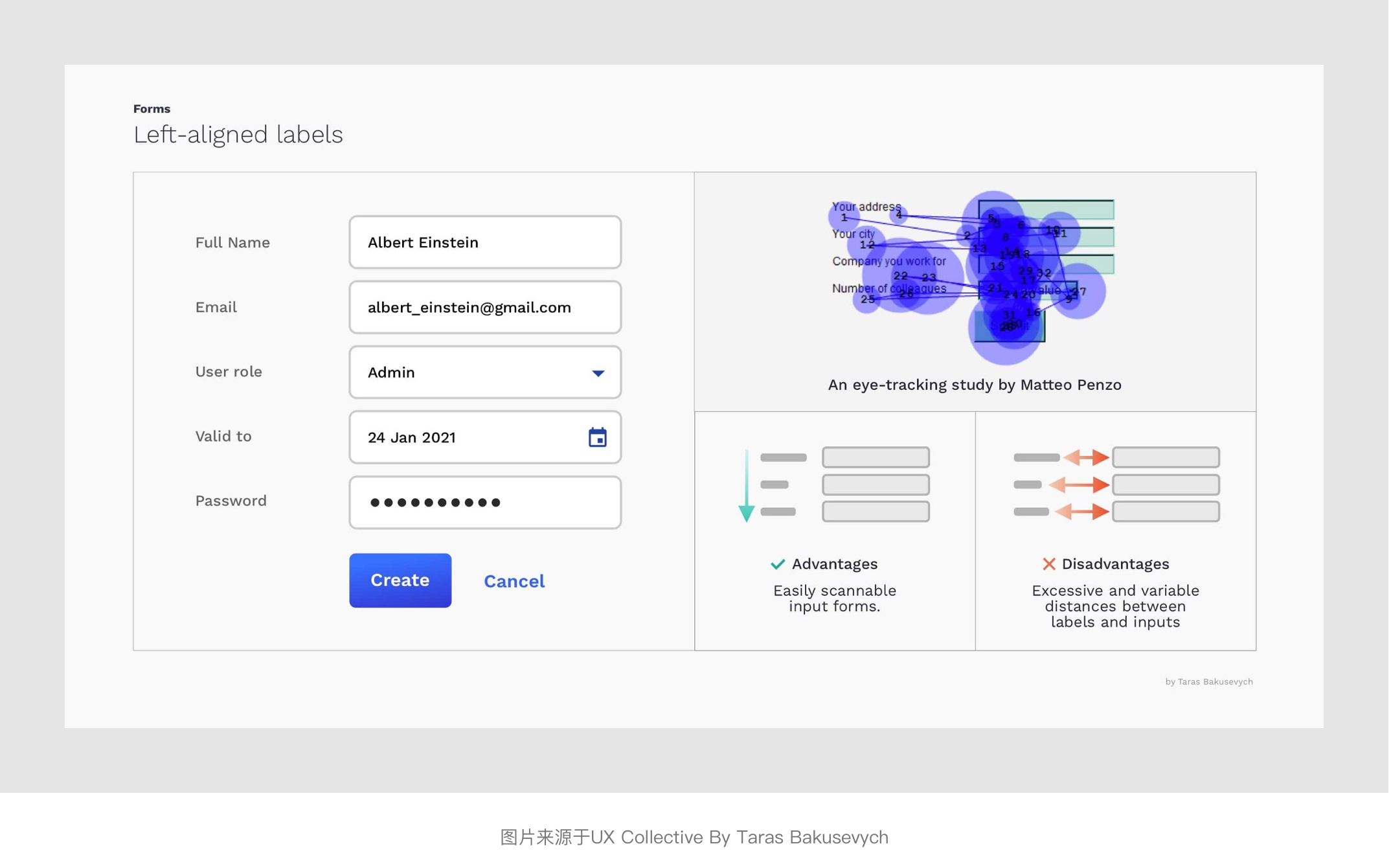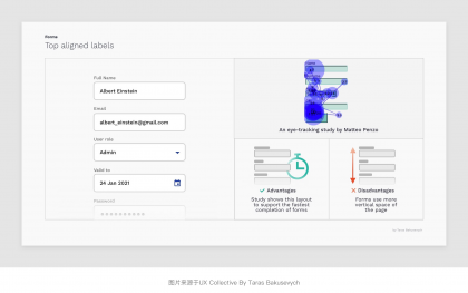 將表單標(biāo)簽放置在其對(duì)應(yīng)輸入字段的正上方,并垂直左對(duì)齊排列,用戶(hù)只需依次向下瀏覽即可看到標(biāo)簽與輸入字段兩個(gè)元素。其優(yōu)勢(shì)是橫向屏幕空間足夠,能夠比較友好的適配多語(yǔ)言適合非中國(guó)區(qū)業(yè)務(wù)表單使用。并且根據(jù)上面Matteo Penzo的時(shí)間表上看,頂部對(duì)齊的瀏覽和填寫(xiě)的效率也是3種常規(guī)的對(duì)齊方式中較高的一種。不足點(diǎn)是會(huì)占用較多的縱向垂直屏幕空間,此外應(yīng)當(dāng)注意每組表單標(biāo)簽和輸入字段與其他字段組的間距,以免層級(jí)區(qū)分度不夠的問(wèn)題。