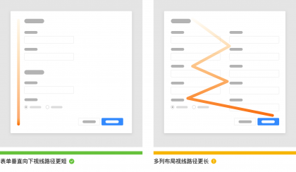 如果表單使用單列,則完成的路徑是頁(yè)面垂直向下的一條直線(xiàn),單列布局能夠給用戶(hù)呈現(xiàn)一條清晰的視覺(jué)路。因此,表單較為簡(jiǎn)單時(shí)盡量避免將表單分成多列,在業(yè)務(wù)場(chǎng)景允許的情況盡量使用單列(部分業(yè)務(wù)訴求和一些特定場(chǎng)景要求,多列布局會(huì)更節(jié)省垂直空間,但是多列布局需要考慮字段之間的關(guān)聯(lián)性,這里不強(qiáng)求一定只能使用單列布局)。