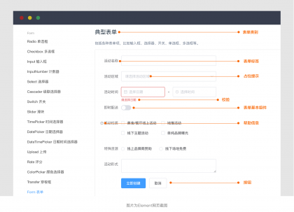 表單組件:包含了輸入框、下拉框、日期選擇器、時(shí)間選擇器、開(kāi)關(guān)、上傳等十幾種類(lèi)型,是形成表單的核心內(nèi)容;