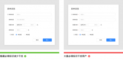 當(dāng)表單中的必填信息多于非必填信息時(shí),如果使用紅色星號(hào)表示必填項(xiàng),那么大量紅色星號(hào)導(dǎo)致增加用戶(hù)的認(rèn)知負(fù)擔(dān),使得用戶(hù)無(wú)法快速識(shí)別哪些是必須填寫(xiě)的,哪些是不必須填寫(xiě)。并且使用紅色星號(hào)會(huì)帶給用戶(hù)一些恐懼感,它增加了出錯(cuò)的風(fēng)險(xiǎn)并降低了表單填寫(xiě)率。因此在表單設(shè)計(jì)中,當(dāng)必填項(xiàng)多于非必填項(xiàng)時(shí),隱藏紅色星號(hào)標(biāo)記,通過(guò)暗提示標(biāo)記可選項(xiàng)的形式來(lái)幫助用戶(hù)識(shí)別。