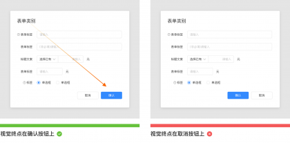 如下圖是一個(gè)彈窗類(lèi)型的表單,如果根據(jù)業(yè)務(wù)訴求確認(rèn)操作重要程度強(qiáng)于取消操作,那么確認(rèn)按鈕應(yīng)該放在取消按鈕的右邊。因?yàn)榇_認(rèn)按鈕放在右側(cè)(終點(diǎn)區(qū)) 用戶(hù)關(guān)注度會(huì)更強(qiáng)。