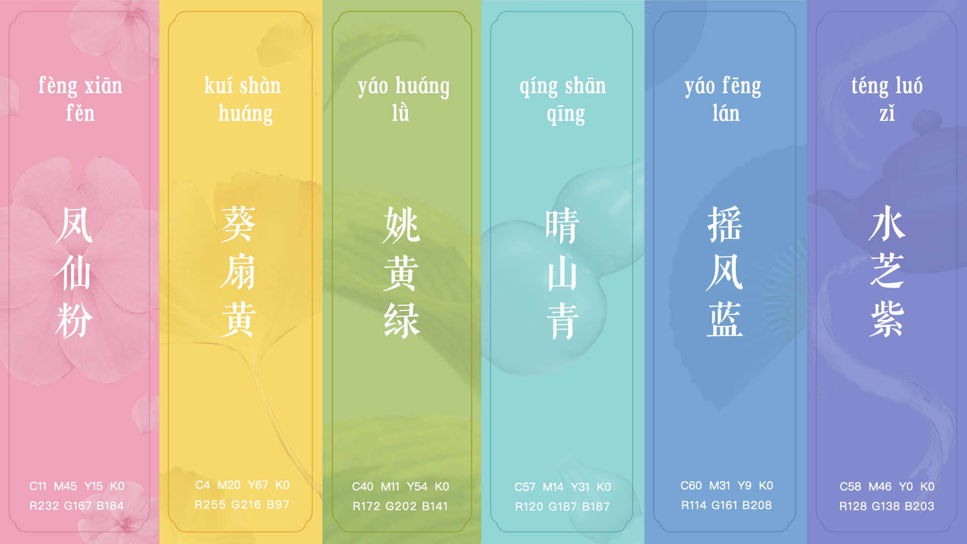 在輔助色上提取上,通過參考古代藝術品,并結合現代審美,提煉出鳳仙粉,葵扇黃、姚黃綠、晴山青等古典色彩,確保輔助色與主色相融合,形成一套和諧的色彩組合。