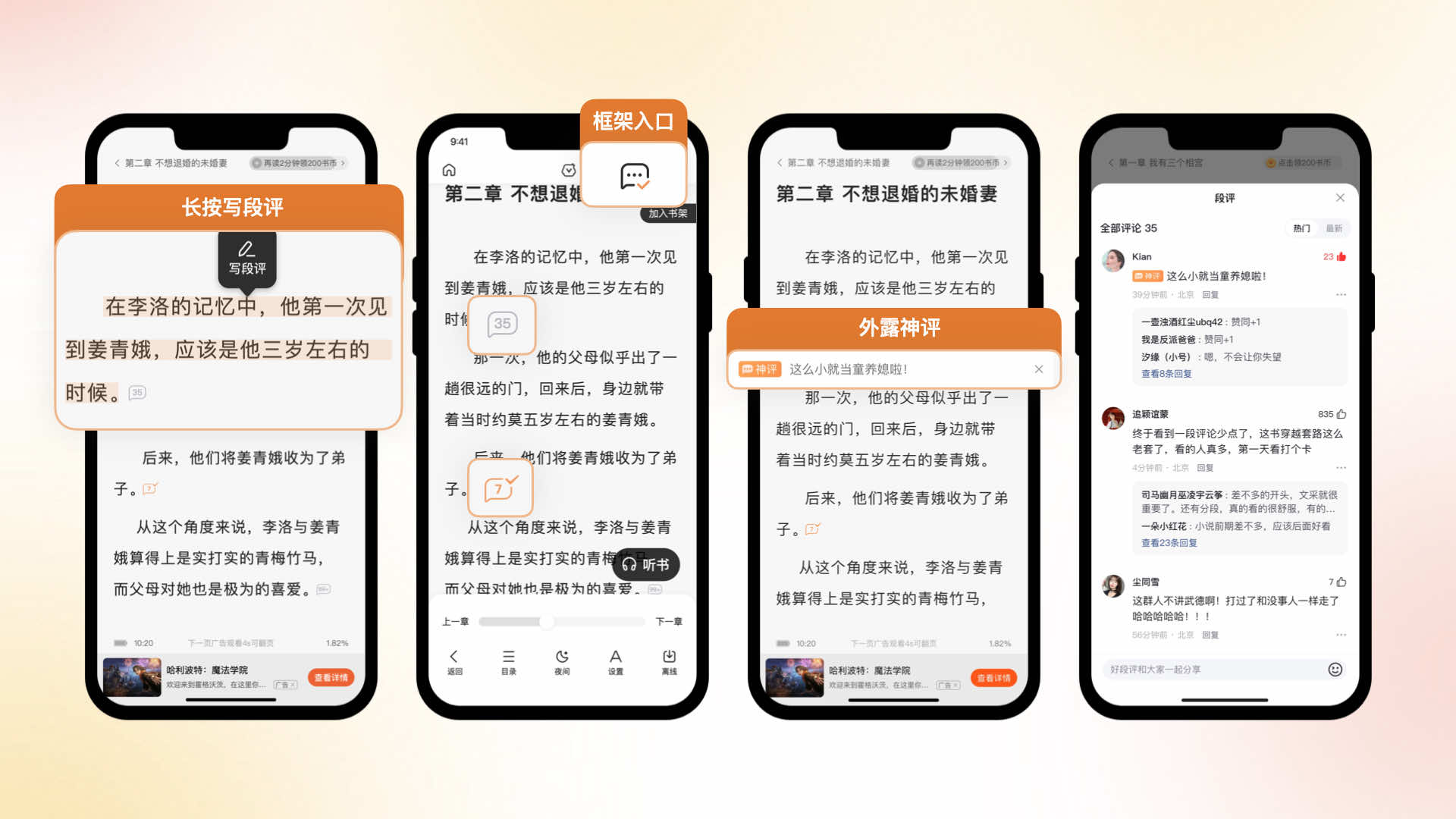 閱讀器場景是用戶使用時長最長的一個場景。因此我們為用戶提供了段評功能,方便用戶閱讀過程中和書友進行交流,為了不影響閱讀的流暢性,我們采用弱化的段評圖標樣式和色彩,段評入口設計在段落尾部,減少對閱讀的干擾。
