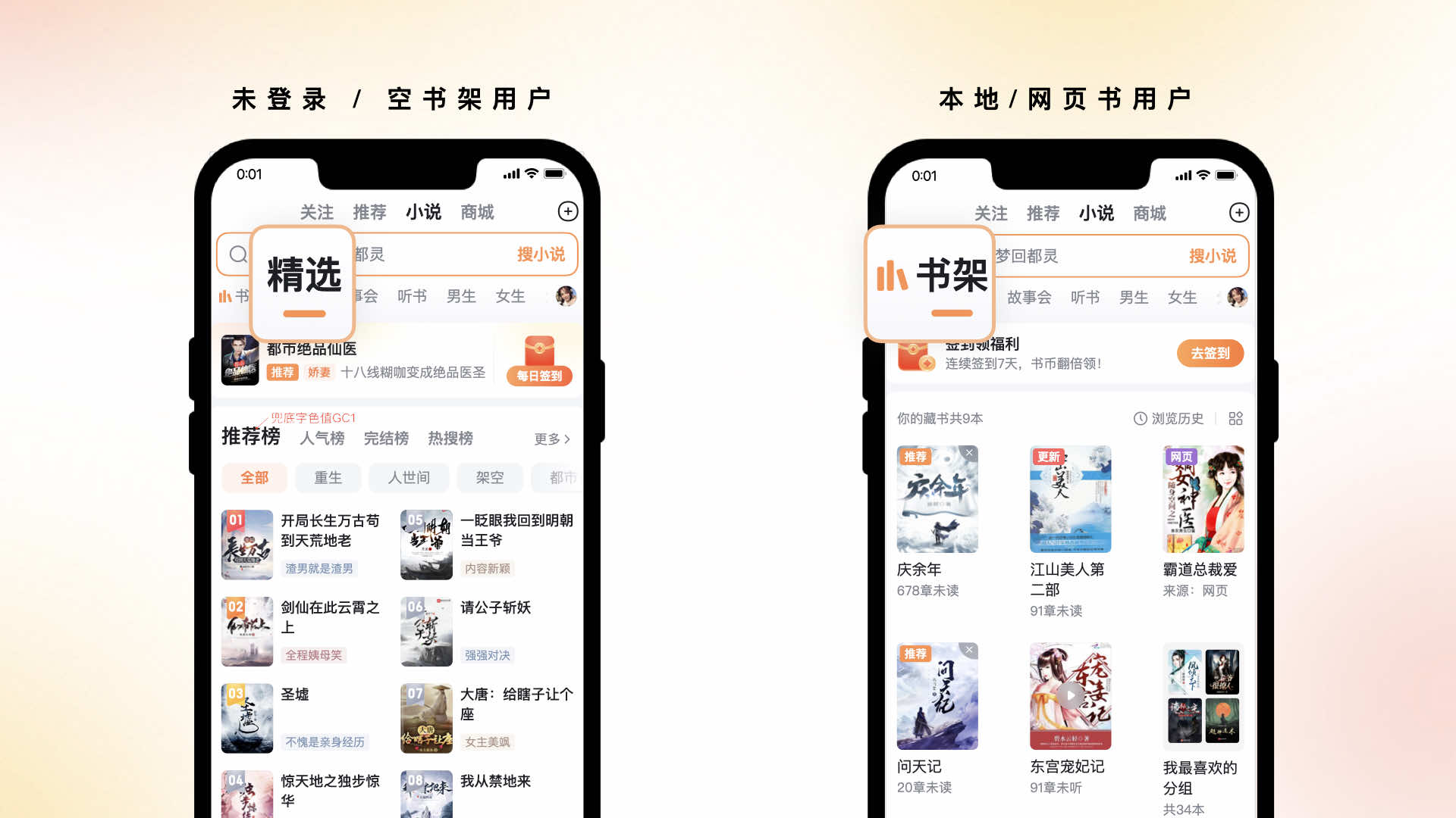 以人為本的設計能夠更貼心地滿足用戶的需求和期望,通過關注用戶的喜好、行為和習慣,讓用戶體會到關懷和舒適的享受。因此,針對于不同的用戶行為進行了精細化的設計。對于未登錄、書架為空的用戶,我們默認為用戶錨定到精選的tab,而針對本地書、網頁書的用戶,我們為其定位到書架的tab,方便用戶更精準的切入場景。