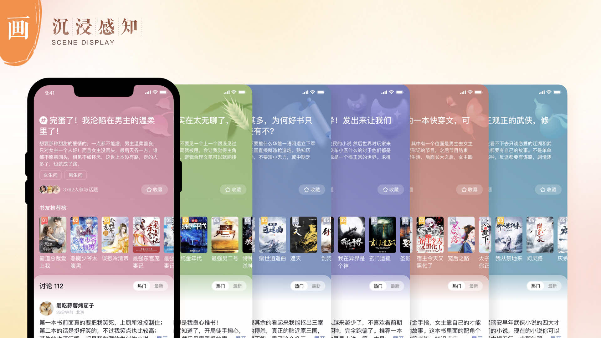 人文感設計語言融合了簡約、舒適、自在的設計體驗,讓人能夠輕松沉浸其中,并感受到獨特的國風韻味和情感內涵。小說設計團隊從“色、字、構、畫”四個維度進行拆解。