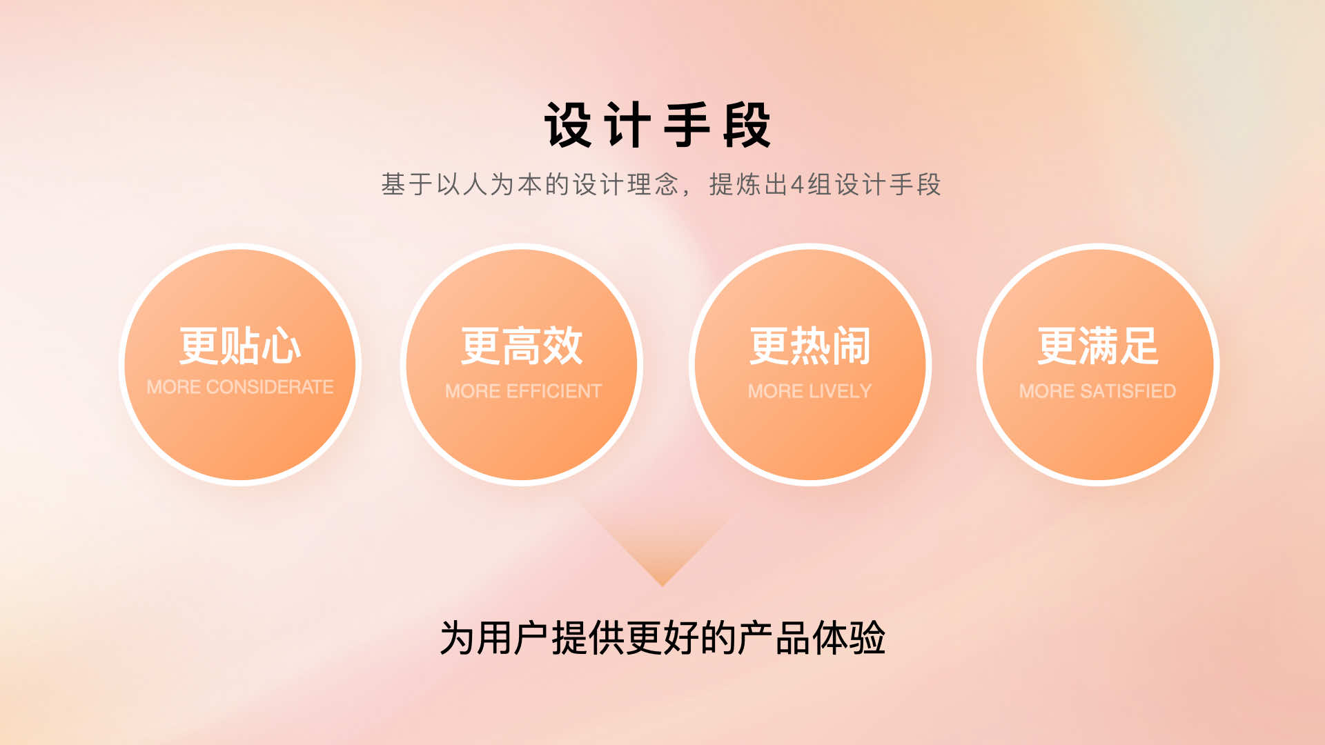 以人為本的設計理念不僅僅是視覺層面的展現,還需要從用戶需求維度提供人性化的產品體驗,因此,我們提煉出了四組設計手段:更貼心、更高效、更熱鬧、更滿足。