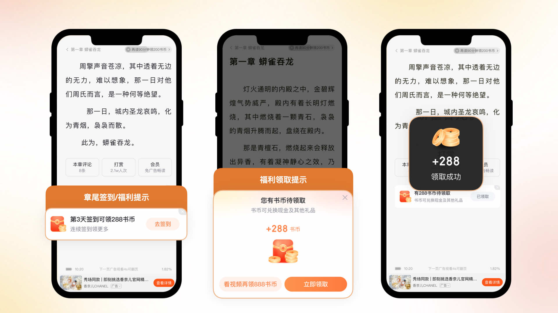 在閱讀器場景,我們增加了章尾和半層金幣領取提示,即時提醒用戶領取福利,同時,強化領取成功樣式,增強用戶的獲得感。