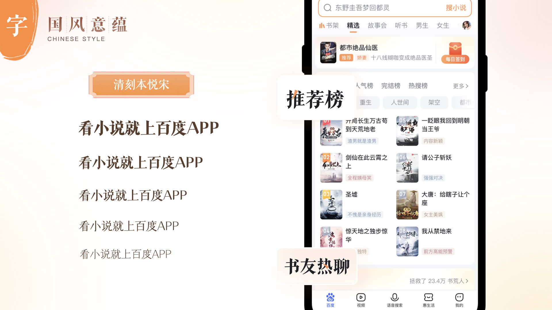宋朝詩人汪洙在《神童詩》中有這樣的千古名句:“萬般皆下品,唯有讀書高。”讀書自古以來是成為高雅風韻的文人士大夫的必經之路。由此可見,自古以來讀書和雅致之間就結下了不解之緣,閱讀與國風雅頌的風格也就找到了完美的交匯點,因此小說設計團隊在確定設計風格的探尋中,選擇了國風的風格來體現百度小說的人文感的設計。
