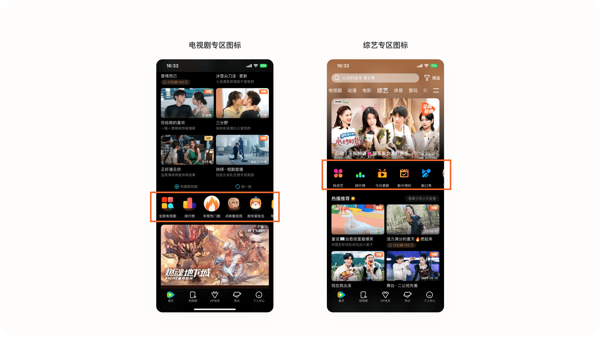 2.2.5設計誤區:分區中的入口icon設計電視劇作為騰訊視頻的高頻點擊分區,在頭部的icon確實有失大廠風范,圖標過大、視覺比例不一致、風格不統一等問題,很影響界面的視覺美感,但入口的點擊轉化是否有影響未知。