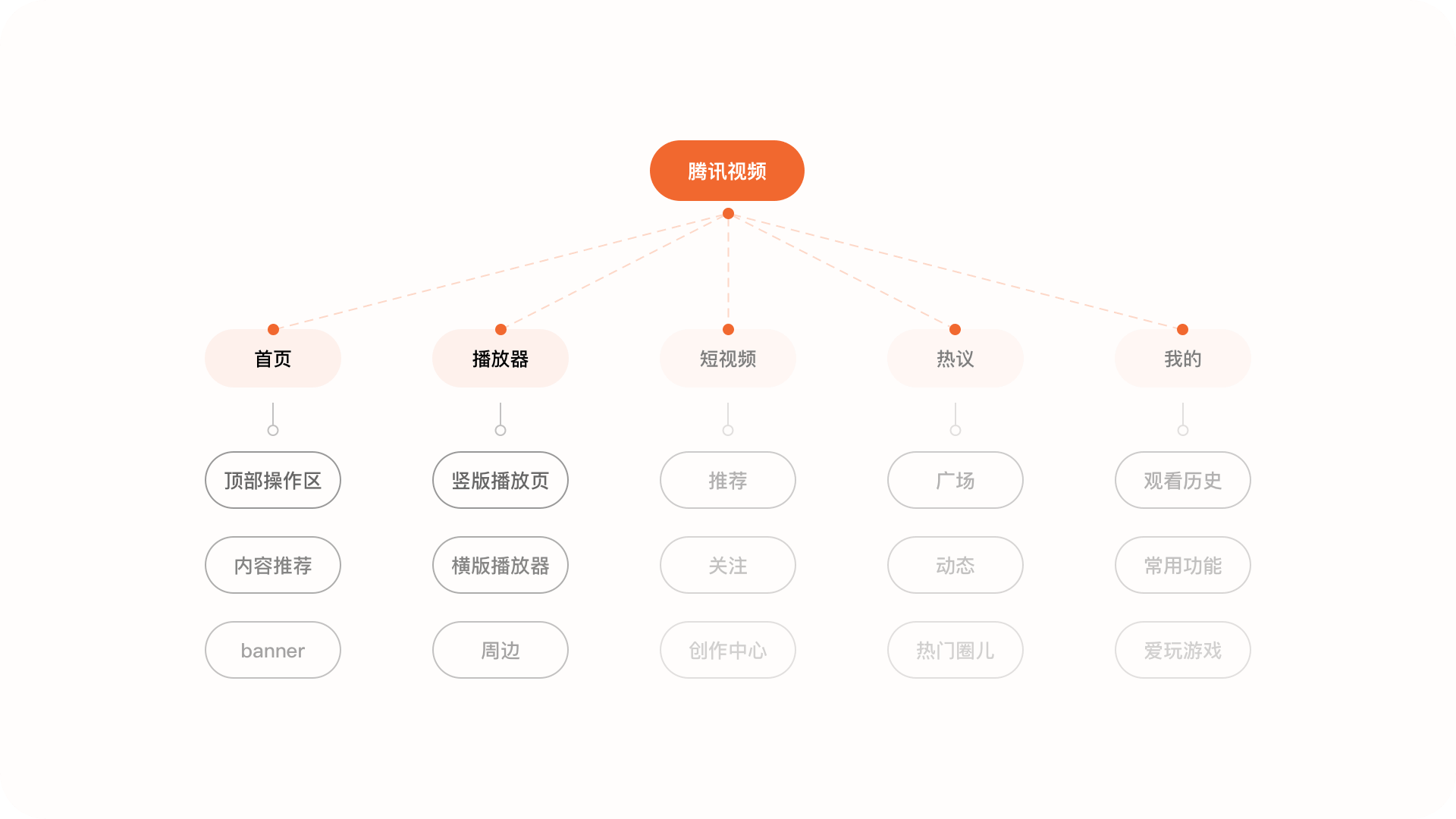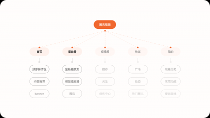 1.內容結構作為視頻內容平臺,通過對騰訊視頻APP的結構梳理,發現產品內大部分的內容都是圍繞視頻來進行拓展,整體框架分為:首頁、短視頻、VIP會員、熱議、我的這幾個模塊。本次我們主要針對于首頁與播放器這兩個場景進行重點分析