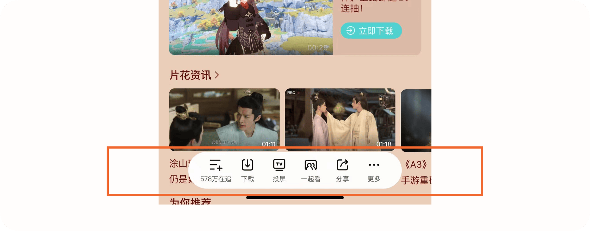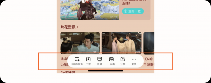 3.1.2產品亮點:底部操作區功能相比其他產品,騰訊視頻在進入豎屏播放頁后不會再頂部的視頻中默認展示操作內容,給用戶帶來更好的觀看體驗,并且把視頻相關的操作內容放置底部做成一個底部操作區,用戶可以在底部快速的對視頻進行操作如:下載、投屏、一起看、分享等。而不是把功能分散在界面中,這樣不僅可以降低用戶的尋找這些高頻操作的成本,同時提升視頻的觀看體驗。
