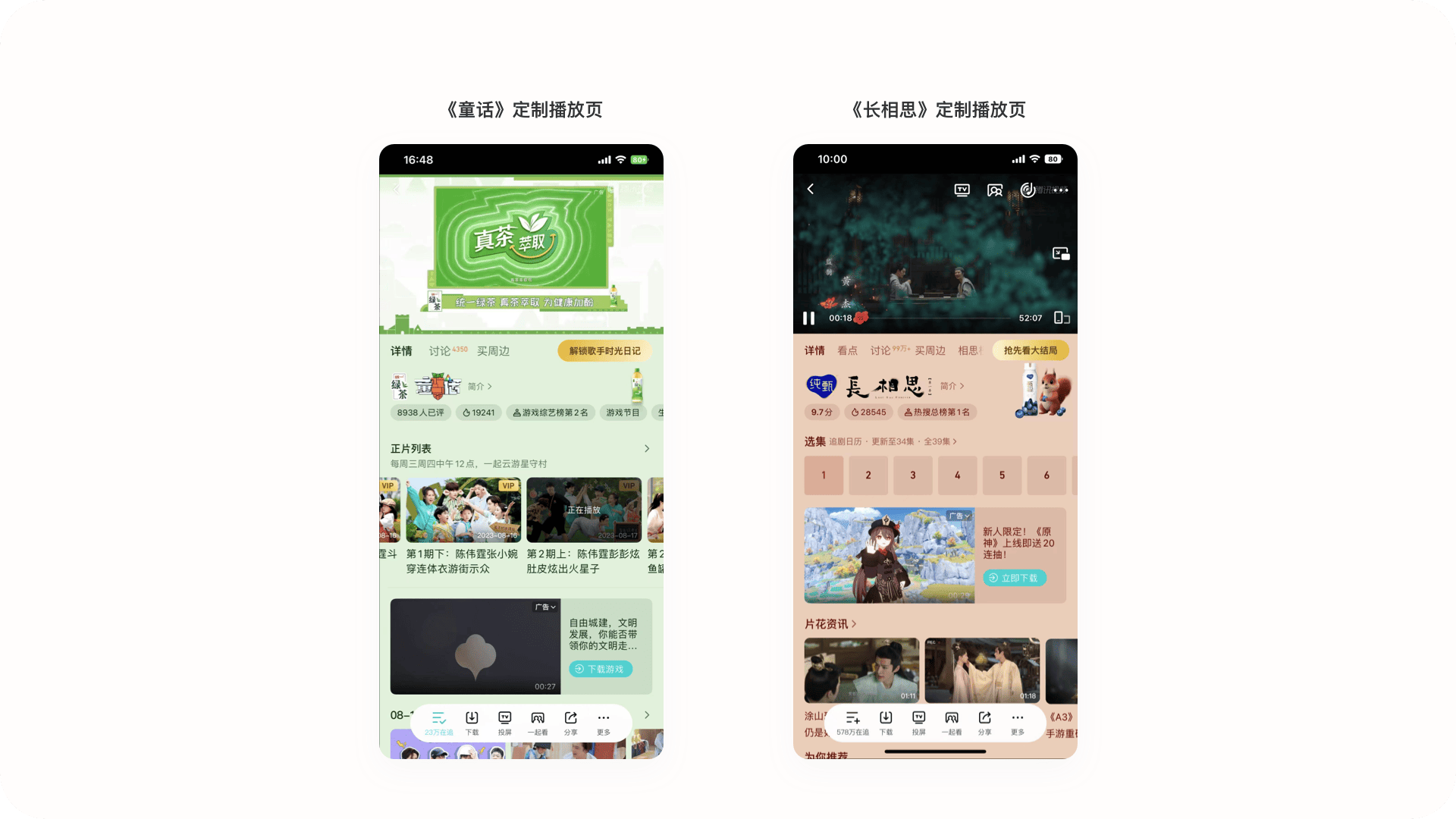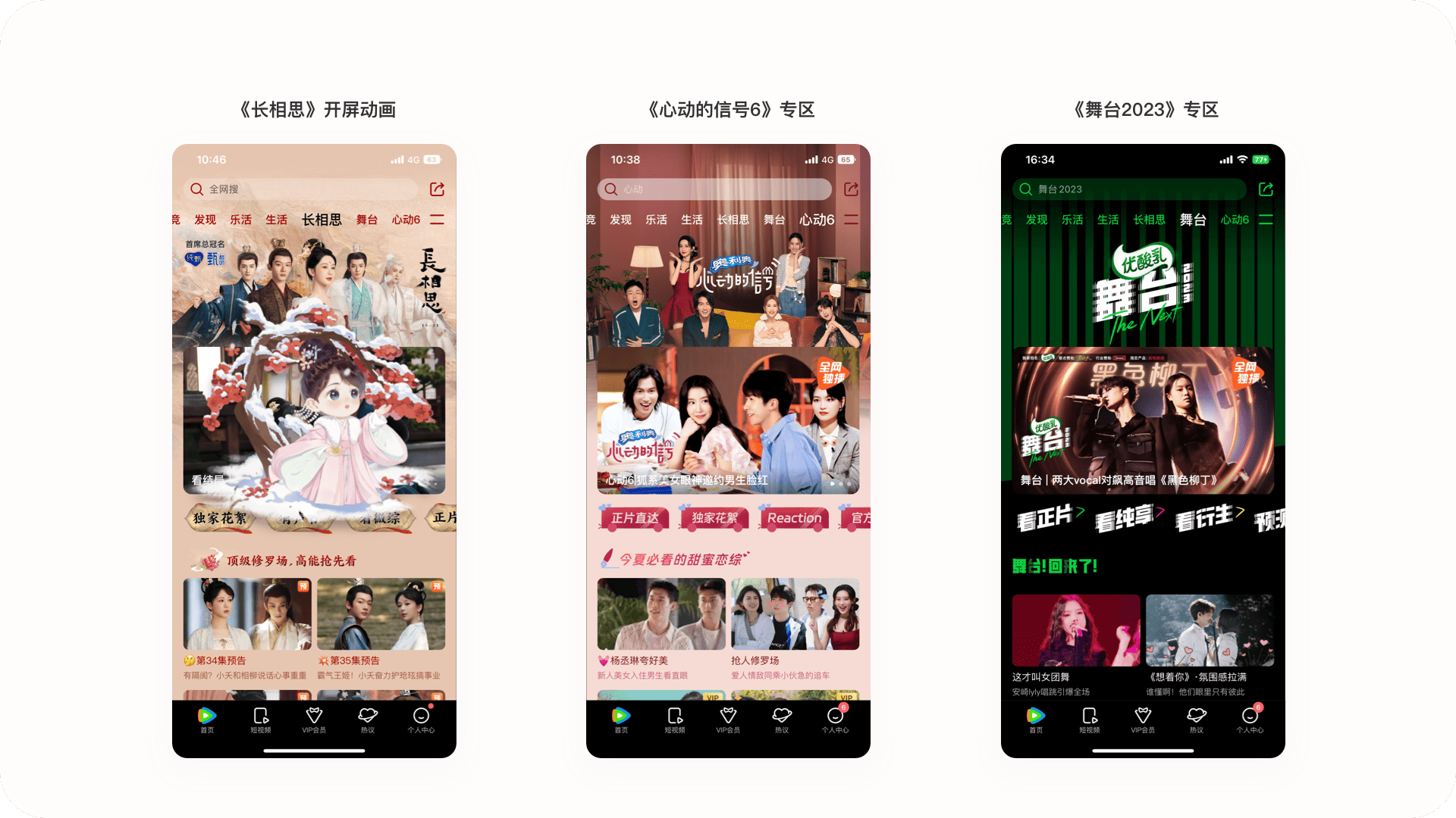 2.2.4設計亮點:不一樣的定制化分區內容頁騰訊視頻會根據站內的熱門內容進行定制化分區內容頁,雖然這種形式在各個視頻平臺都有設計,但騰訊視頻的似乎更加與眾不同,它相比其他競品不僅增加了開屏動畫,加強界面氛圍感,同時在功能上增加了一級標題,如在長相思專題中的“獨家花絮、有聲書、看微綜、相思榜”等入口,可以讓用戶在頁面中發現更多劇情本身以外的衍生內容,一級標題的形式也可以讓用戶直達視頻播放頁,快速了解想要看到的視頻內容。