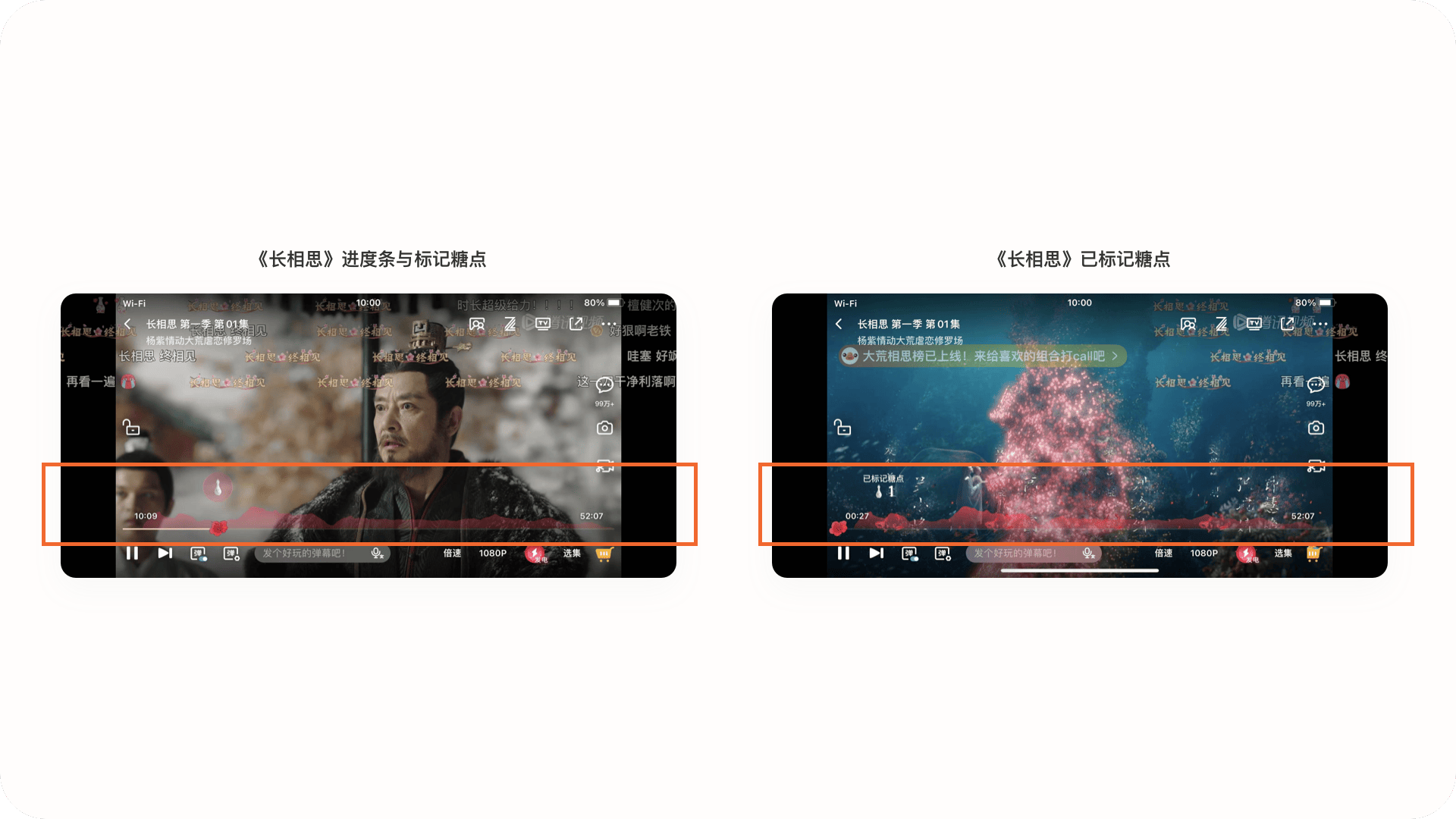 3.2.1設計亮點:定制化進度條與標記糖點對應熱門視頻內容,騰訊視頻會定制化進度條樣式與進度點樣式,(如《長相思》中定制紅色木槿花)讓用戶更加沉浸的觀看體驗,同時在進度條上方有標記樣式,用戶點擊會觸發標記動效與糖點,所有標記的糖點數據也會以波動圖的形式顯示在進度條上方,提高互動玩法。