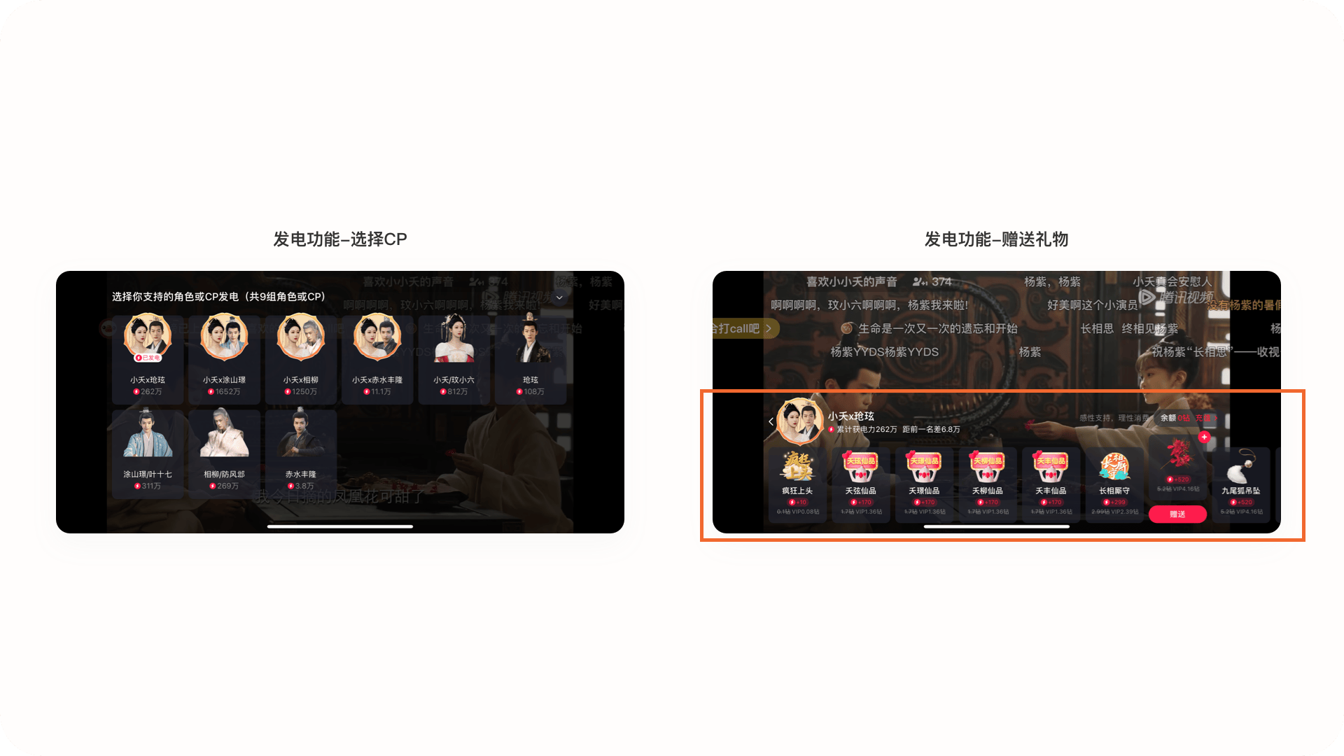 3.2.2產品亮點:發電功能為自己支持的CP上分在底部操作區增加發電功能,用戶可以點擊為自己支持的cp送出禮物,不僅可以滿足用戶的“嗑CP”心理,同時對直播場景中的核心送禮功能很好的結合到視頻產品中,給視頻內容提供了商業價值,提高產品收入。