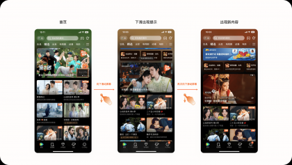 2.1.5設計亮點:下拉刷新新玩法大多數產品下拉都為刷新界面操作,但騰訊視頻對下拉進行兩部交互操作,用戶下拉到第一個階段會出現提示"下拉發現更多好玩"當前這時用戶松手可以進行常規刷新操作, 但用戶看到這樣的提示會更想知道在向下拉到會帶來怎么的內容,當用戶再次下拉后會出現對應的內容推薦,類似于游戲推廣與熱播劇推廣,賦予用戶驚喜感的同時還能增加廣告收入。