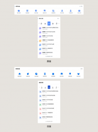 在快速入口和日程模塊中,都有使用裝飾圖標(biāo),顯然大家也能理解他們對(duì)于目前的語境來講還是細(xì)節(jié)過多了,所以需要做一些調(diào)整,讓它們簡(jiǎn)化。