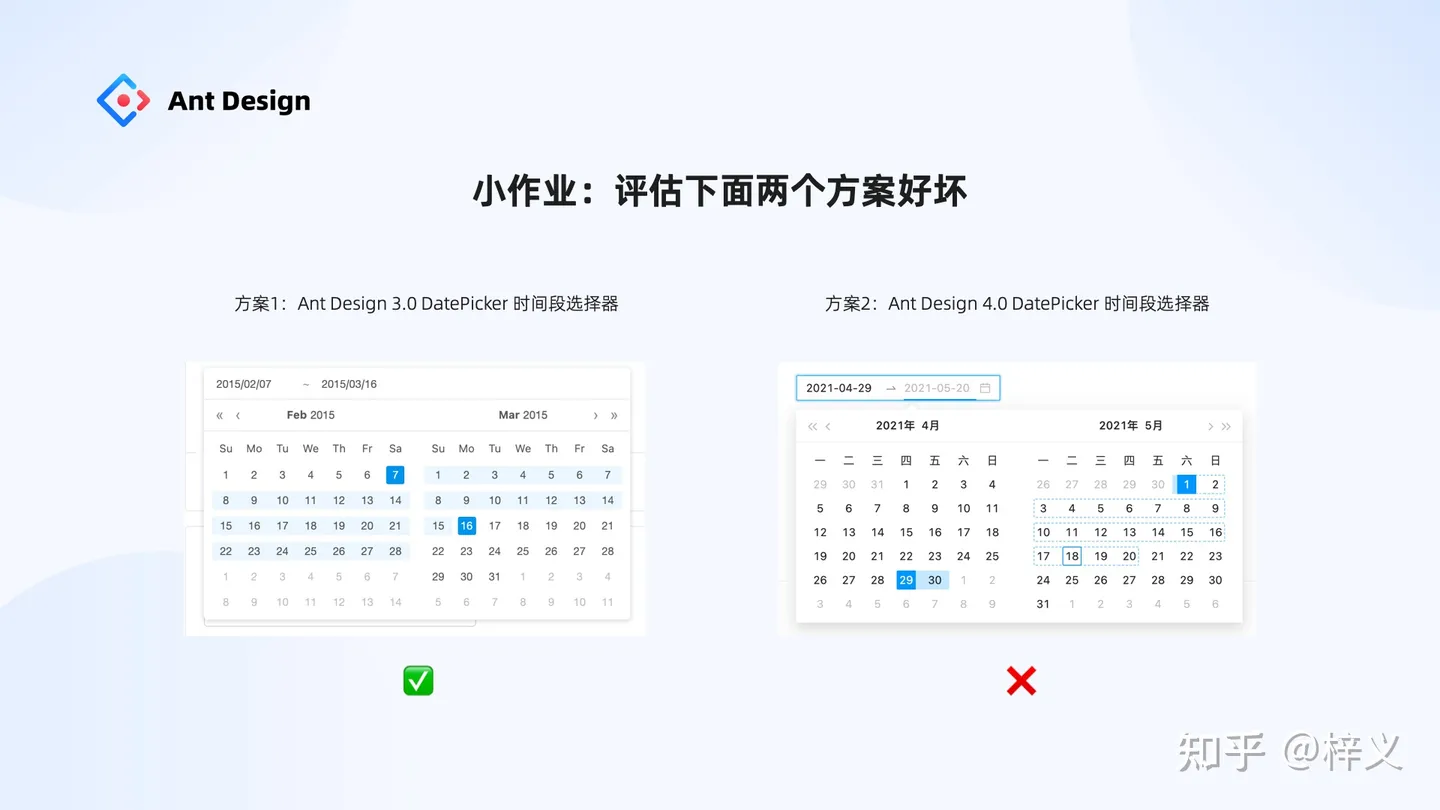 時間原因,就不再講解更多案例。這邊給大家預留一個小作業,我們在 4.0 的時候升級了 3.0 日期選擇器的交互,請大家用元規范評估模型評估一下哪個方案更好?