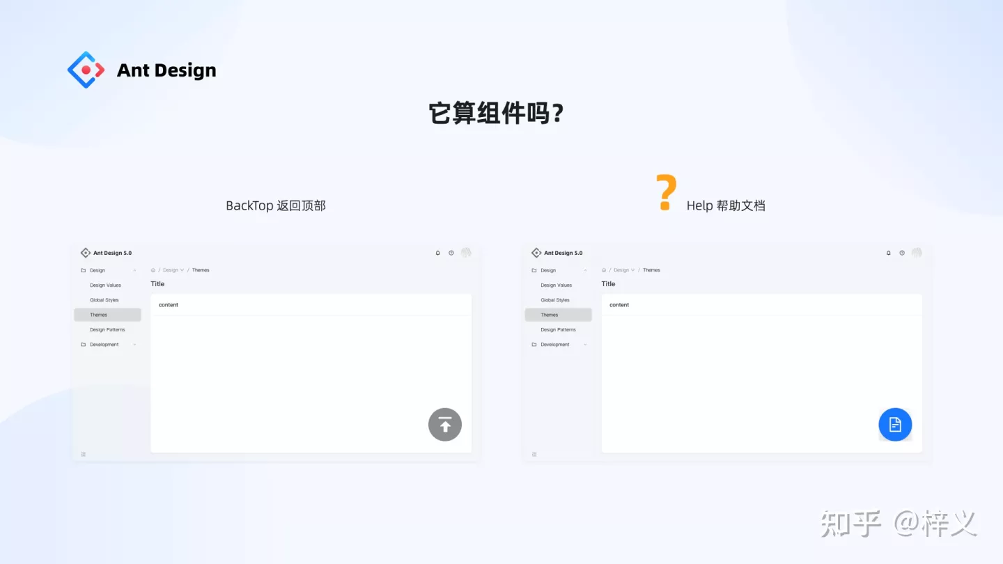 第三個問題,BackTop 組件在 Ant Design 4.0 之前作為一個獨立組件而存在,請問,它真的算是一個組件類型嗎?如果算,那右邊這種情況是否應該歸為新的一類組件?