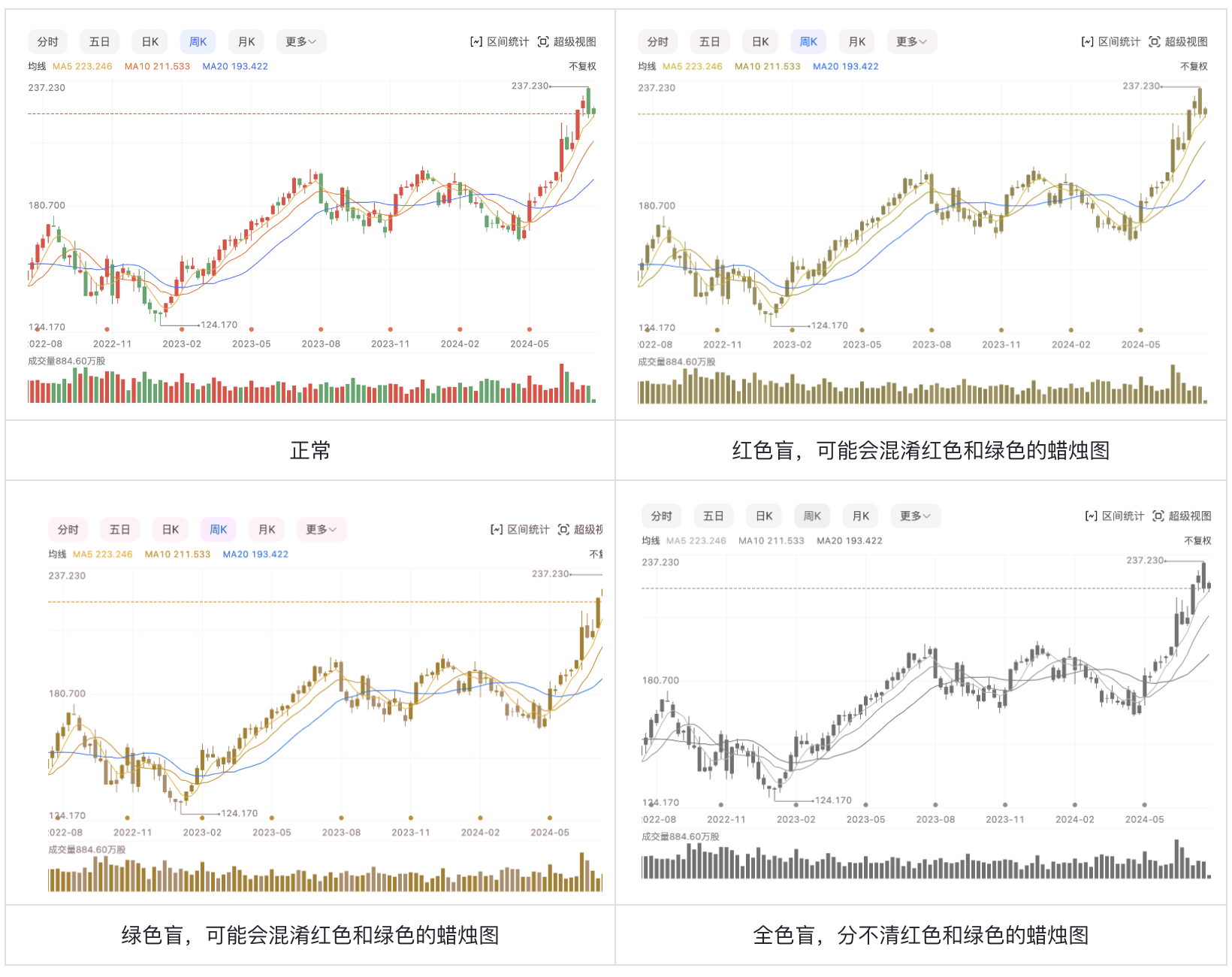 舉個例子,在個股詳情K線圖頁面,上漲用空心圖形表示,下跌用實心圖形表示,這種方法不僅幫助色盲用戶識別信息,還增加了視覺上的吸引力。