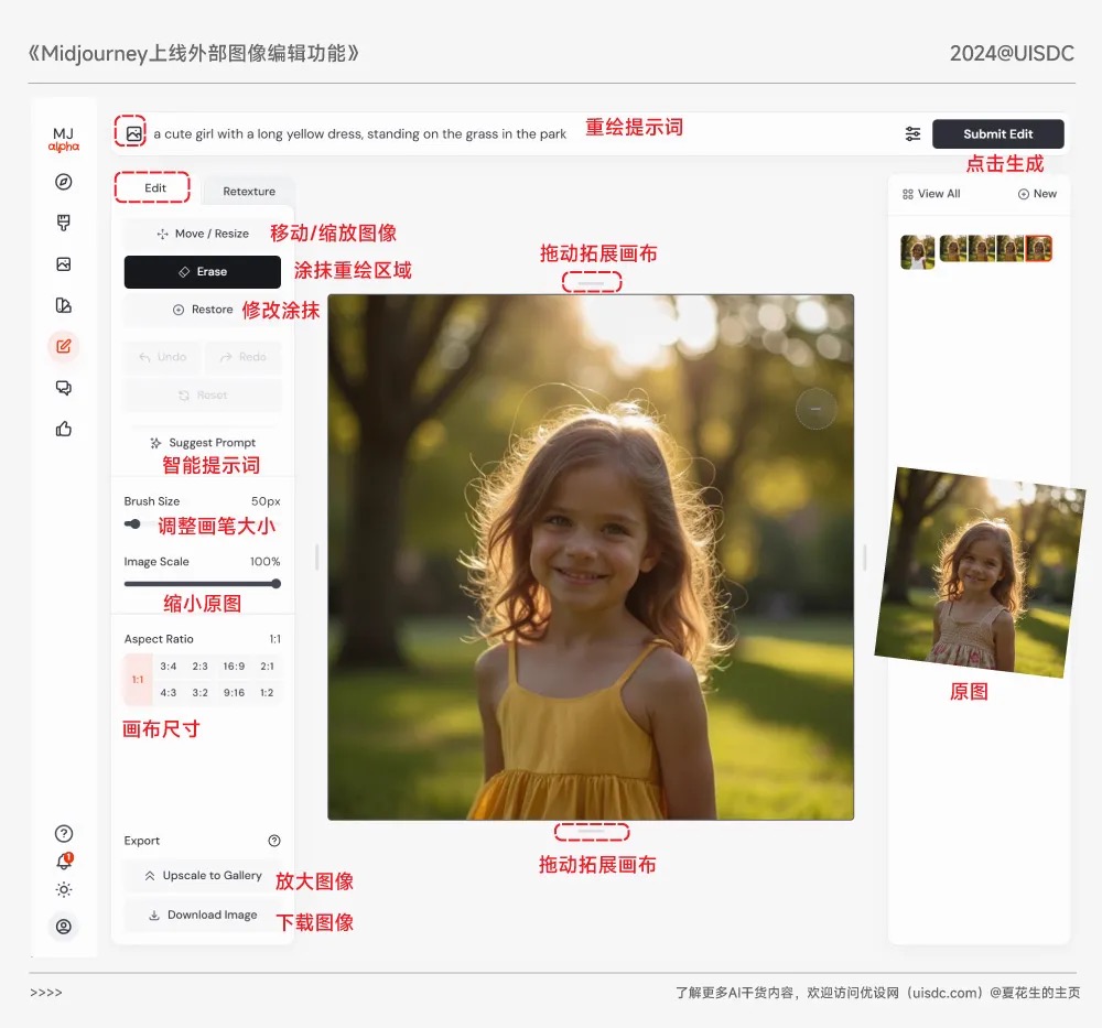 Edit(編輯)功能:支持局部重繪和外繪擴展。可以涂抹需要重繪的區域,并輸入提示詞進行編輯。支持連續多次編輯,提高工作效率。