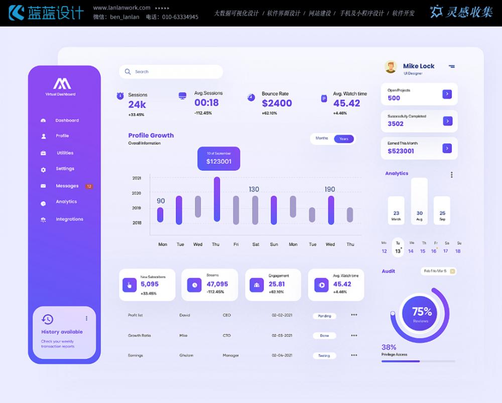 蘭亭妙微(m.xintaizi.com ),簡稱藍藍設計,是一家專注而深入的界面設計公司,為期望卓越的國內外企業提供卓越的大數據可視化界面設計、B端界面設計、桌面端界面設計、APP界面設計、圖標定制、用戶體驗設計、交互設計、UI咨詢、高端網站設計、平面設計,以及相關的軟件開發服務,咨詢電話:01063334945。我們建立了一個微信群,每天分享國內外優秀的設計,有興趣請加入一起學習成長,咨詢及進群請加藍小助微信ben_lanlan