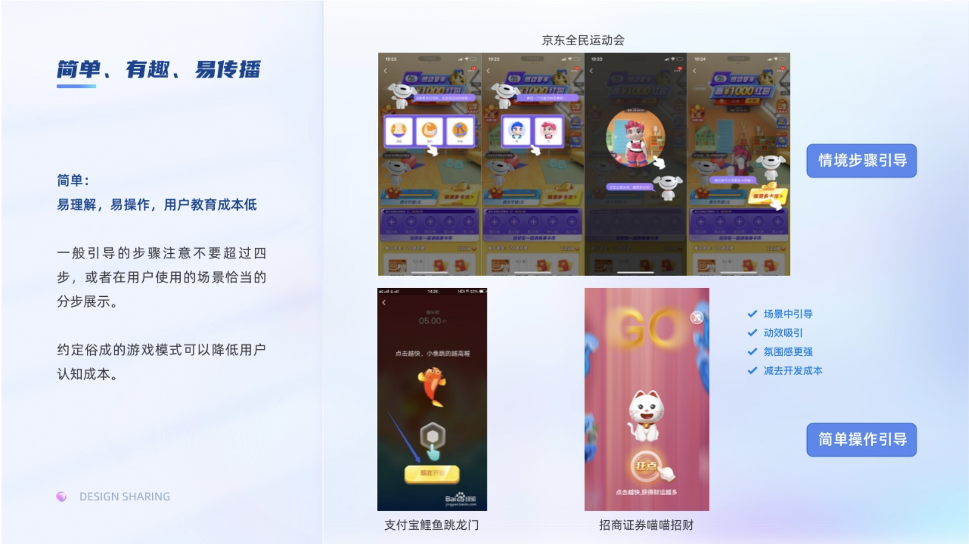 簡單:是指用戶易理解,教育成本低,操作簡單。在運營設計中一般我們會與游戲結合,在此我稱為游戲運營。在游戲運營的設計中,如果不是一個約定俗成用戶都熟悉的游戲任務,教育用戶如何操作的成本是相對較高的,需要有詳細的操作引導。一般引導的步驟注意不要超過四步,或者在用戶使用的場景恰當的分步展示。比如鯉魚跳龍門游戲操作就比較簡單,引導只需要一個簡單的提示;而京東全民運動會作為大型活動比較復雜,引導步驟較多,對一步分用戶來說認知成本高就不會參與活動。