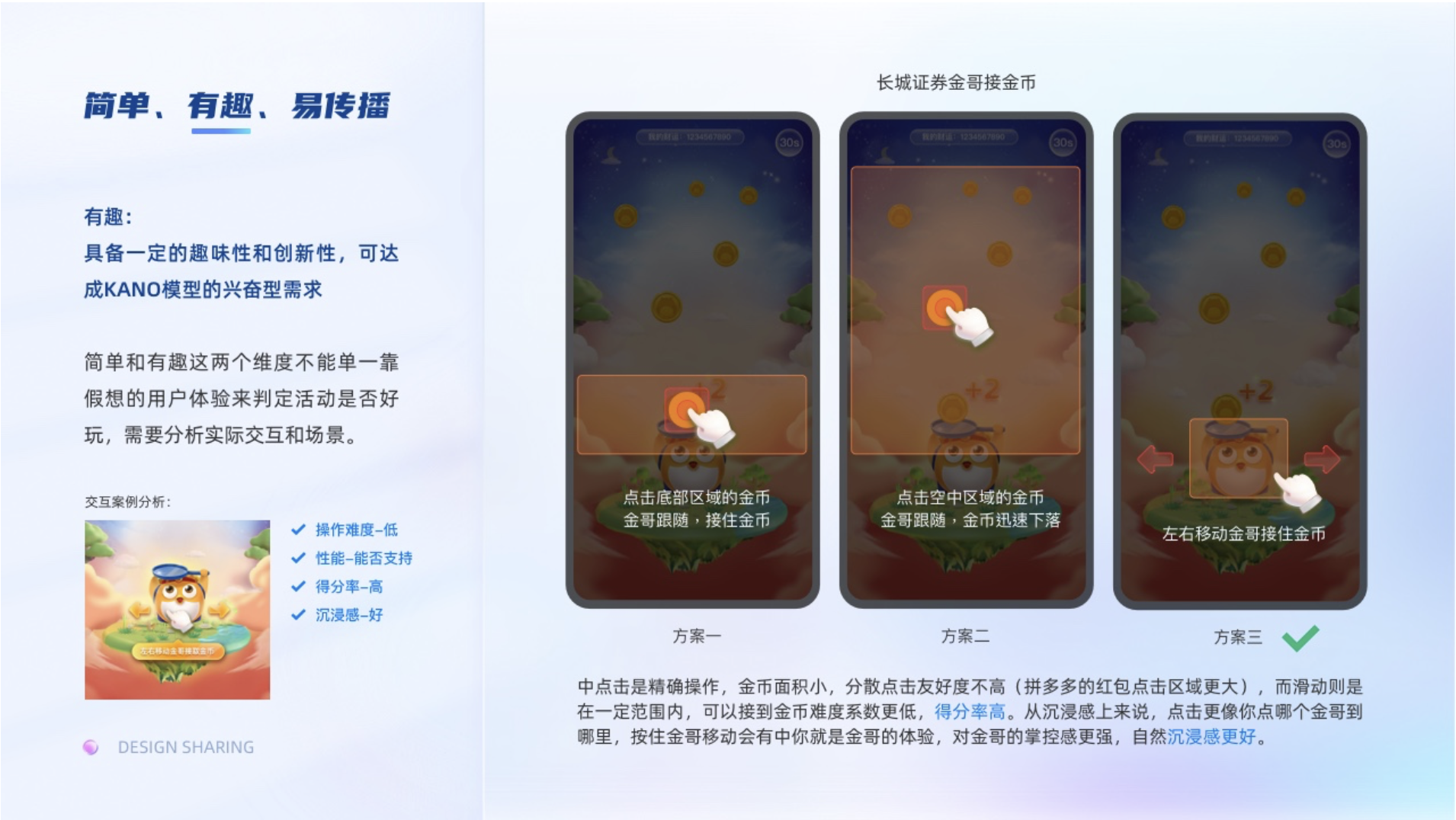 設計方案時,需要考慮到開發實現的可行性。比如活動的任務得分和游戲得分規則機制,開發算法能否實現,如果開發算法難以實現就會導致大返工。所以需要及早跟開發做好評審工作,并且是很細致的評審,只是粗略評審后續還會出現問題。