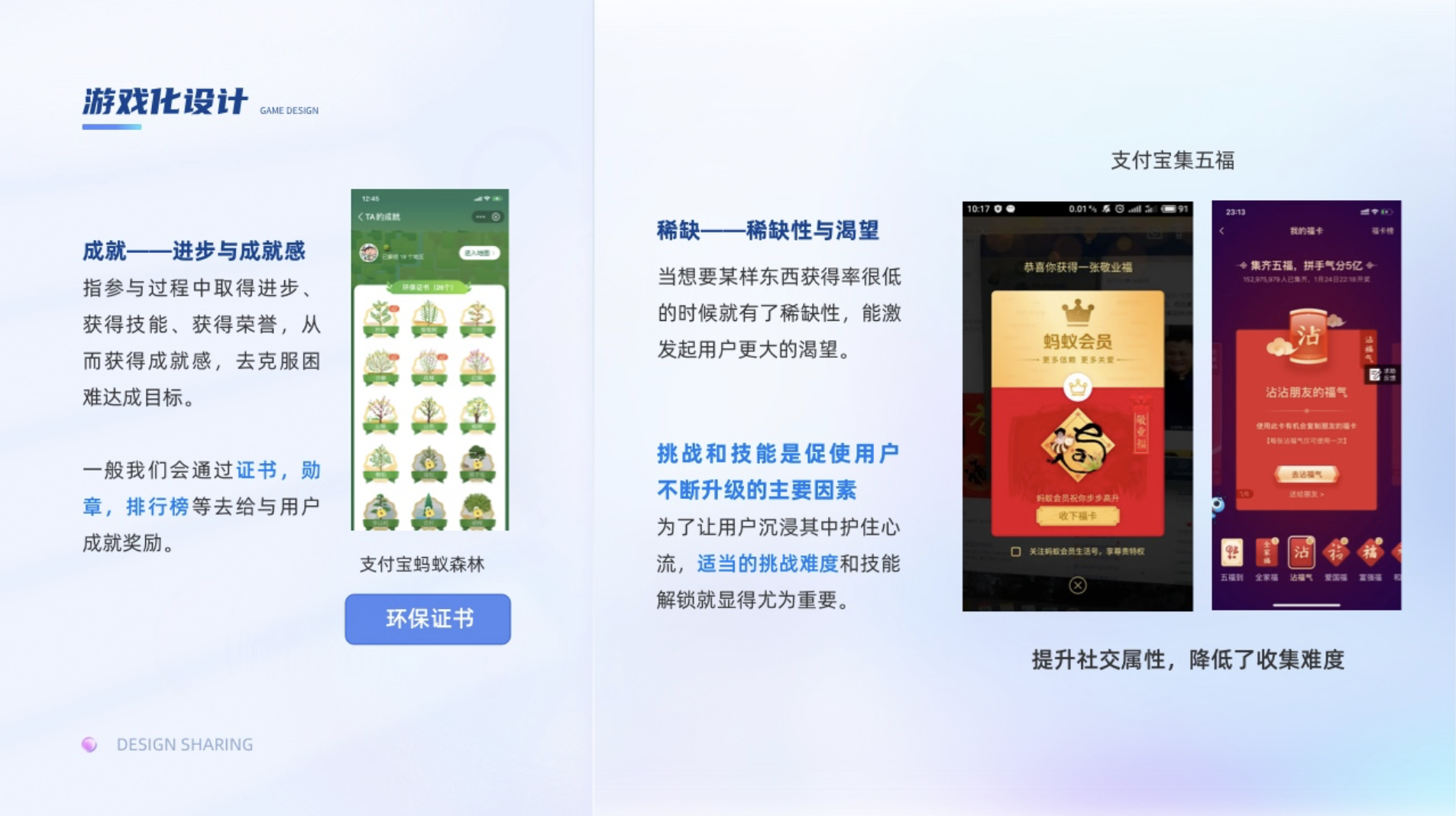 指參與過程中取得進步、獲得技能、獲得榮譽,從而獲得成就感,去克服困難達成目標。一般我們會通過證書,勛章,排行榜等去給與用戶成就獎勵。挑戰和技能是促使用戶不斷升級的主要因素,為了讓用戶沉浸其中護住心流,適當的挑戰難度和技能解鎖就顯得尤為重要。挑戰難度高了容易引起用戶的焦慮,難度低了又會讓用戶感覺無聊。比如集卡行動,在考慮總預算不變的情況下,如何設置稀有卡的比例,集卡的難度就尤為重要。支付寶集五福在初期,敬業福的比例比較低,所以用戶抽到敬業福的體驗就很開心,但隨著支付寶后面為了擴大社交屬性,提高了集齊率,集五到五福的興奮感就弱了,導致部分用戶失去動力,因為集到的人越多后續瓜分的錢就越少。