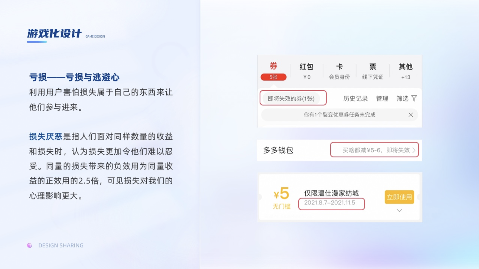 利用用戶害怕損失屬于自己的東西來讓他們參與進來??梢越Y合損失厭惡來理解。損失厭惡是指人們面對同樣數量的收益和損失時,認為損失更加令他們難以忍受。同量的損失帶來的負效用為同量收益的正效用的2.5倍,可見損失對我們的心理影響更大。比如商家發給你的免費優惠券,其實你本身不需要購買什么,但是商家偏偏在優惠券上加上時效性,超過活動日期就置灰了,即使你原本沒有購買需求,但是感覺沒用掉優惠券就像損失了優惠券的錢一樣,就會去購買,甚至為了湊單購買更多東西。