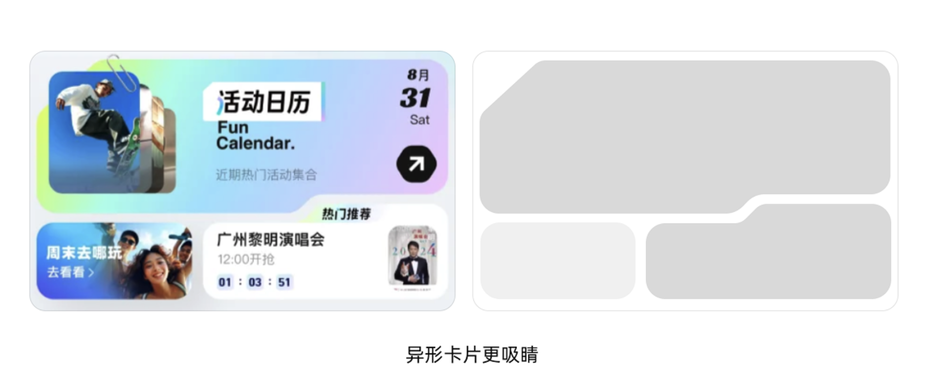 讓卡片脫穎而出的不止傾斜,我們還可以給卡片做出異形效果,用「不規則」的圖形激活用戶感官敏銳度: