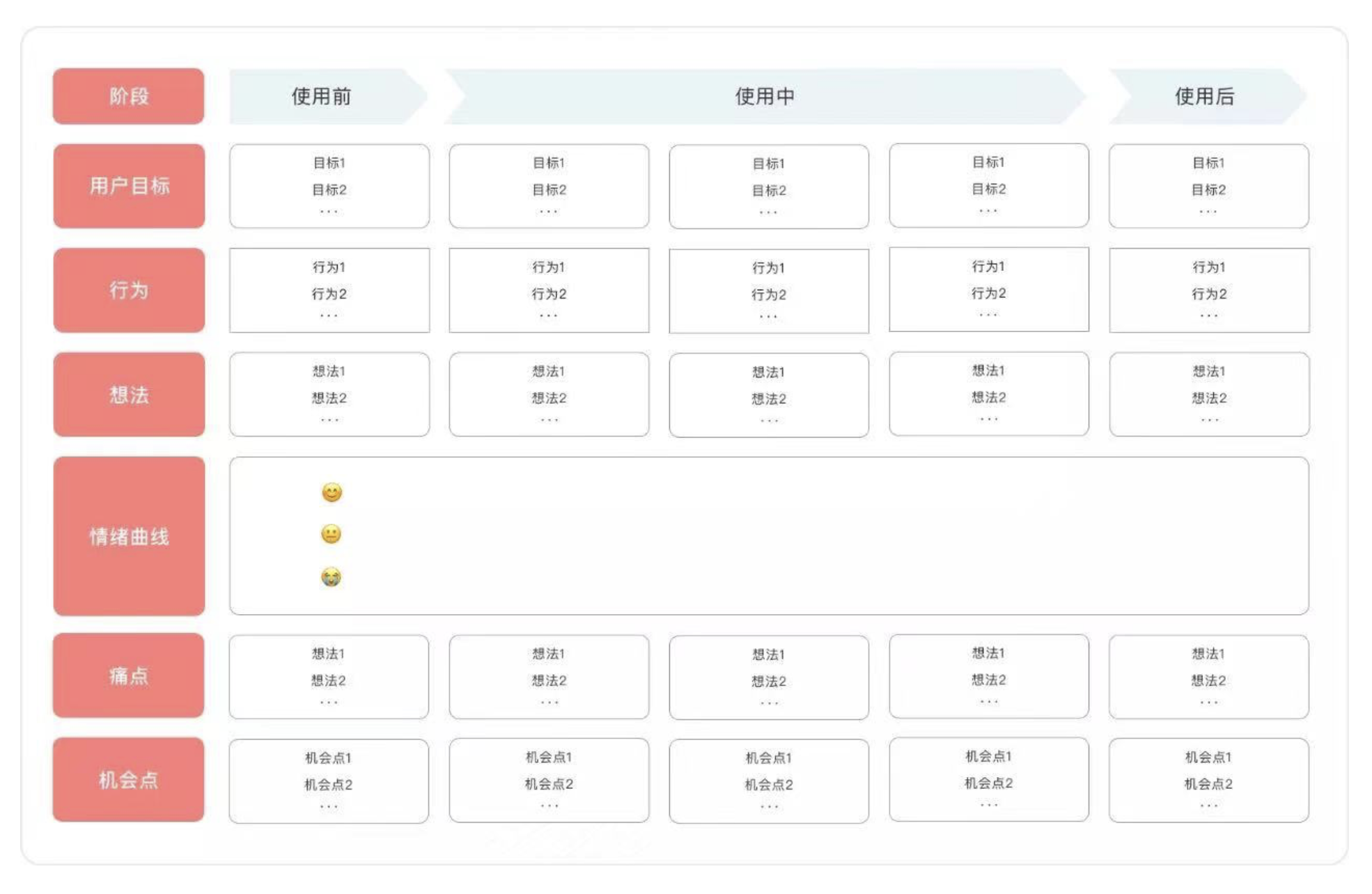 • 定義:可視化用戶全流程行為與情緒,還原 “使用前 - 中 - 后” 階段的目標、觸點與痛點。
