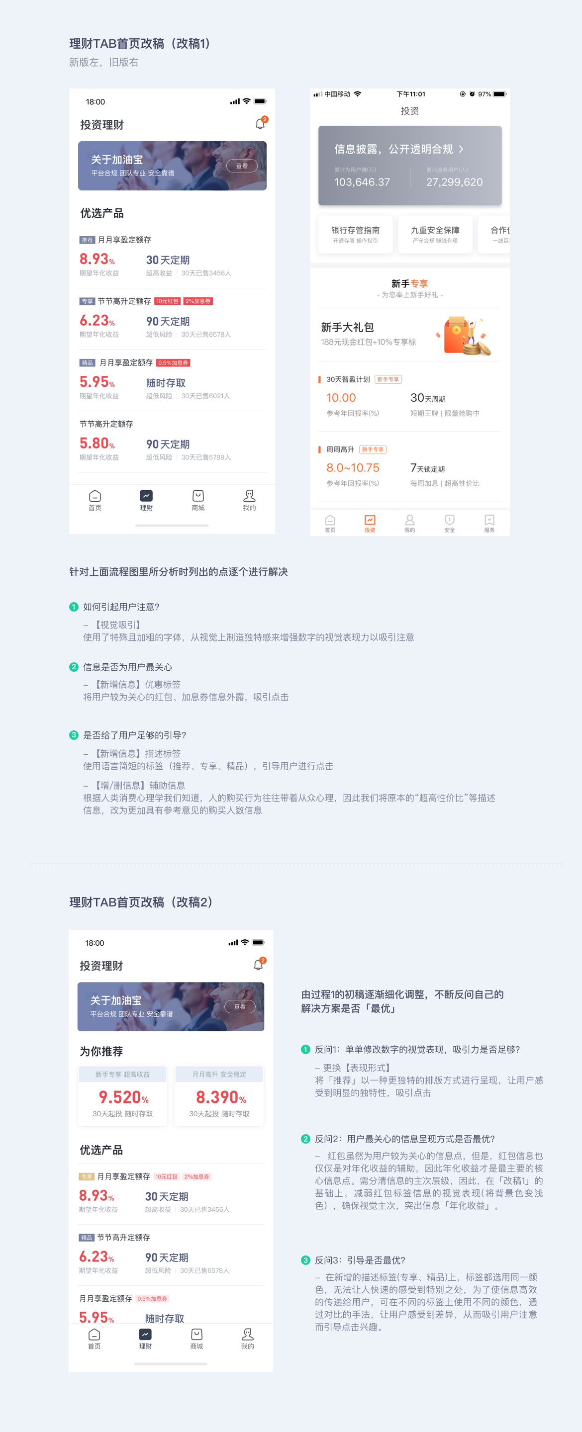 • 6.0 改版措施:將收益數字從 “7.00%” 改為 “9.520%” 并加粗,添加 “新手專享 188 元紅包 + 10% 專享標” 等信息,增加「推薦」「精品」標簽。