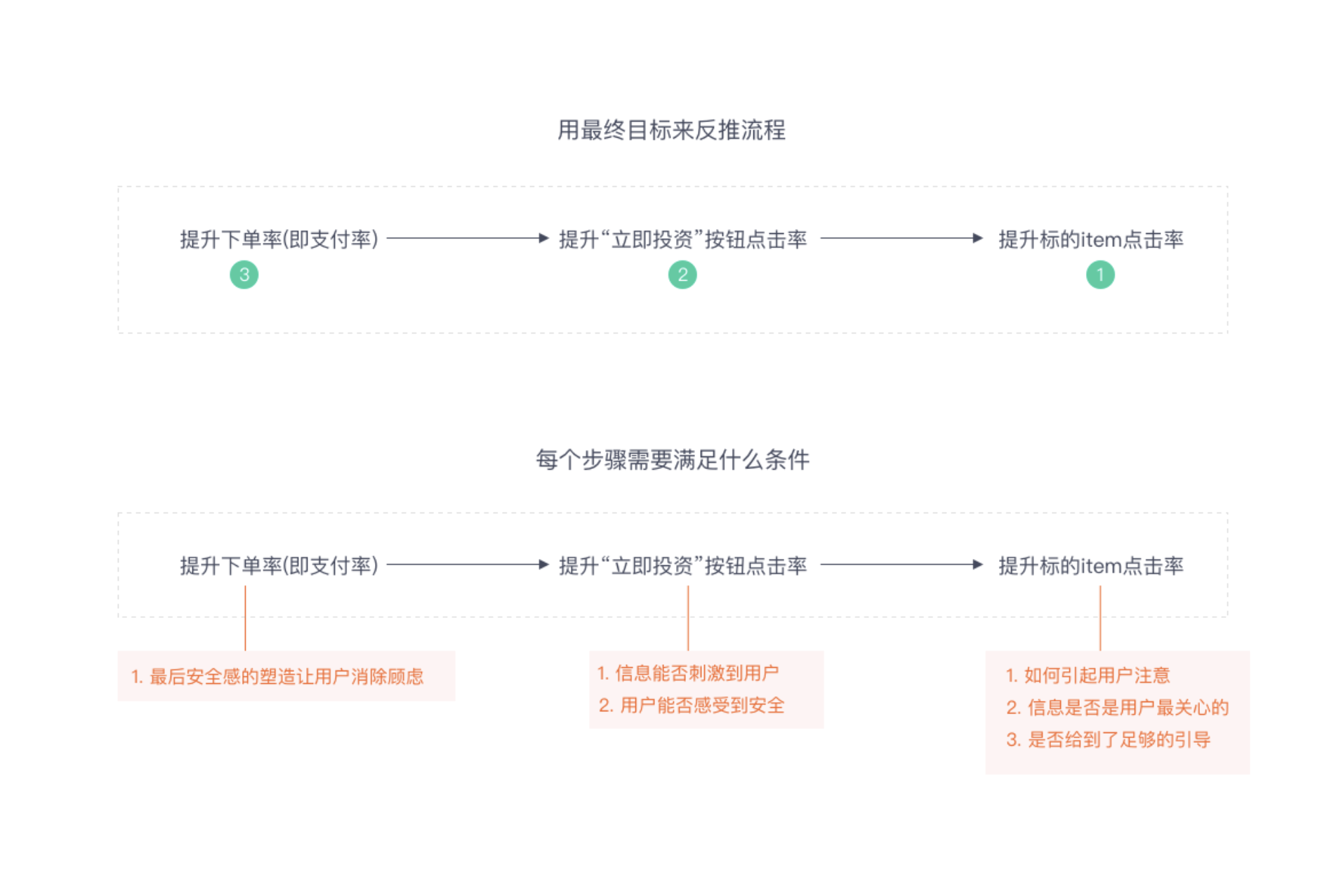 • 以提升下單率為例,分析各環節需滿足條件: