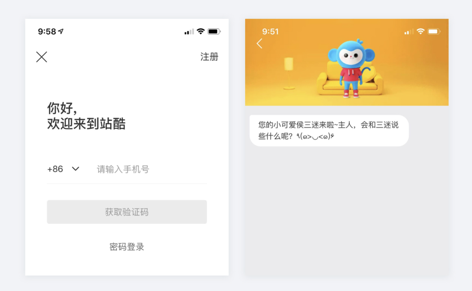 • 有趣的擬人化動作設計:產品作出擬人化互動反饋,讓用戶感到有趣,如嗶哩嗶哩 APP 登錄輸入密碼時,IP 形象 22 和 33 會把眼睛捂起來,給用戶安全感且有趣。