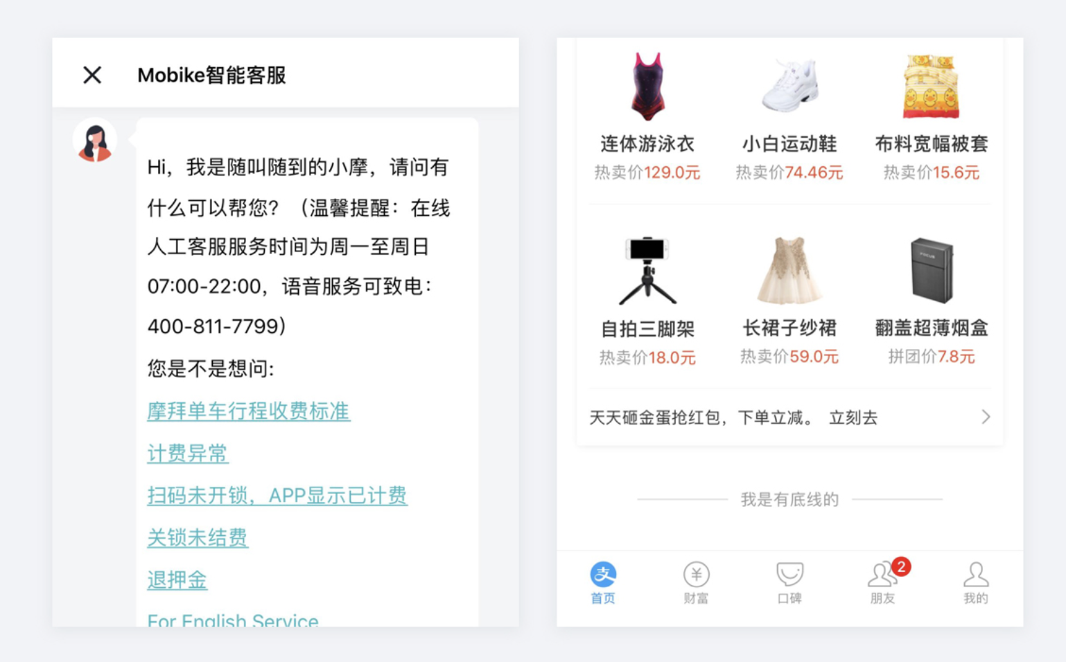 • 明確服務者定位的設計:站在服務者角度,以親近方式與用戶溝通,讓用戶感受產品溫度,如摩拜單車 APP 在線客服用 “您” 稱呼用戶,支付寶 APP 用 “我是有底線的” 幽默文案拉近關系。