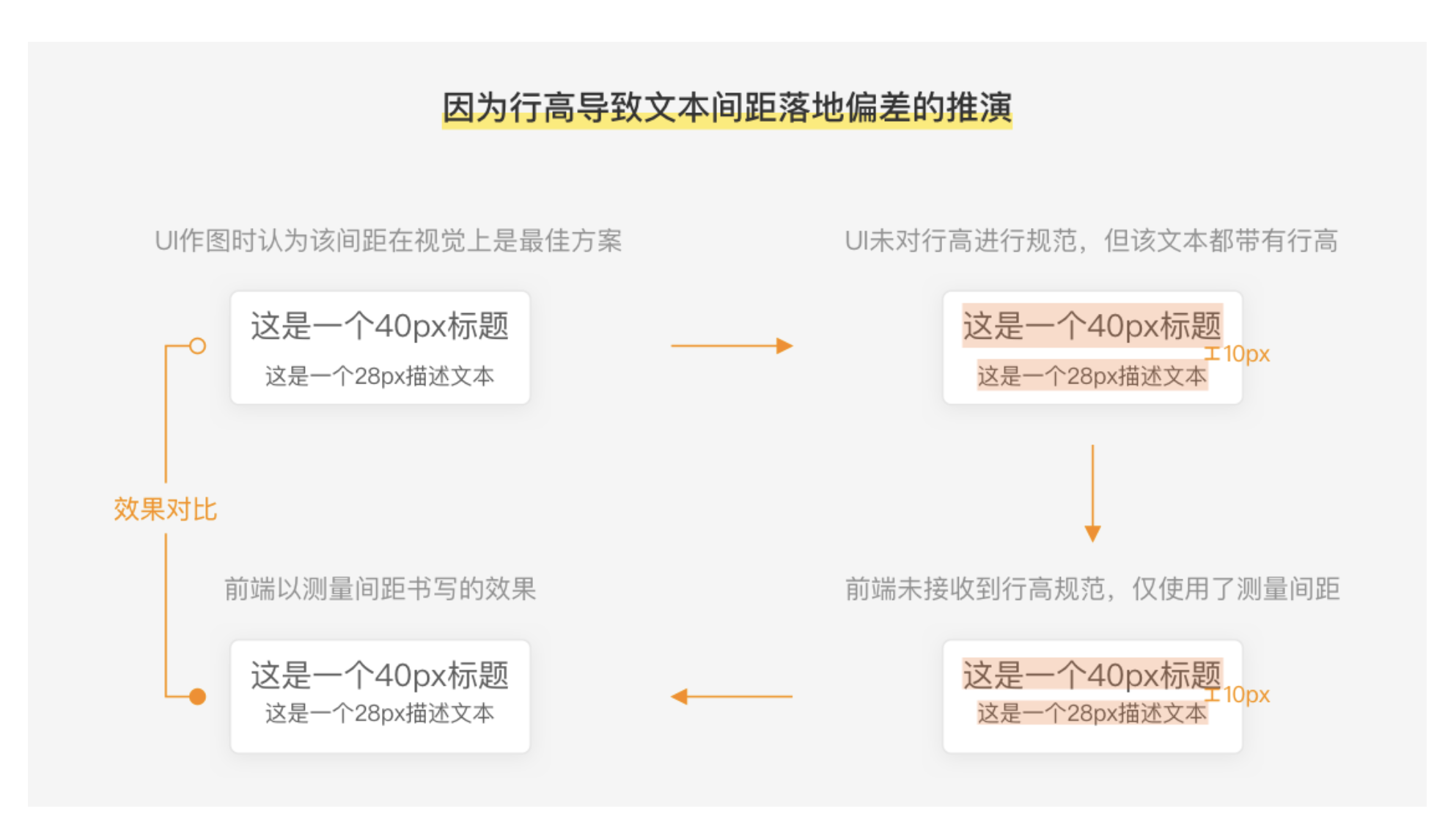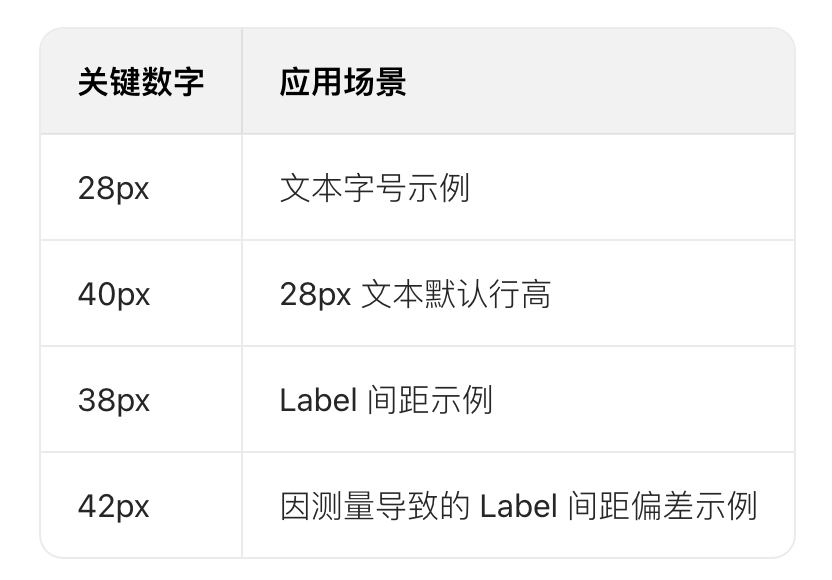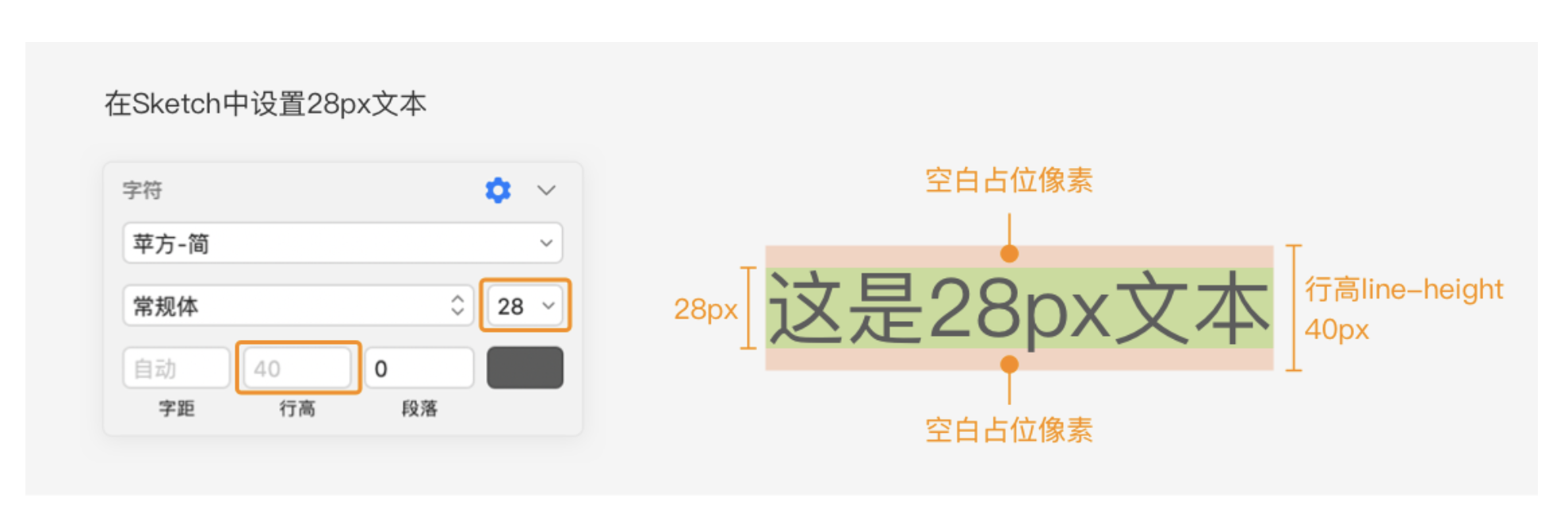 • 文本間距:文本行高可能導(dǎo)致前端測量誤差,如 28px 文本 Sketch 默認行高 40px,上下含空白像素,UI 需輸出規(guī)范行高(如 x 倍行高或具體值)與前端對接,避免因行高導(dǎo)致間距落地偏差。