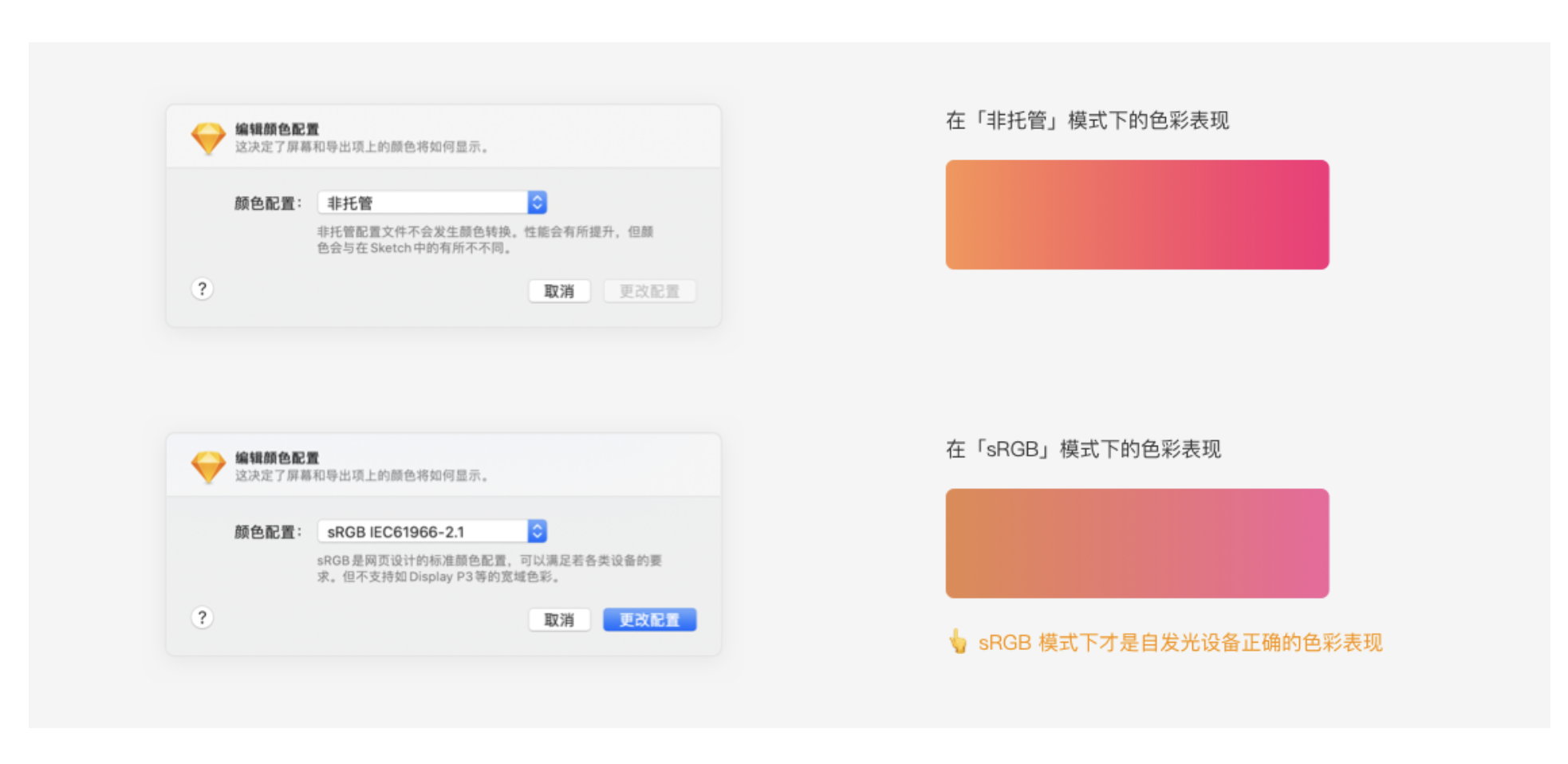 • 顏色模式:Sketch 中新建文件默認顏色模式為 “非托管”,色彩顯示比自發(fā)光設(shè)備艷麗明亮,需更改為 sRGB 模式,否則落地界面會比設(shè)計稿更暗更臟。
