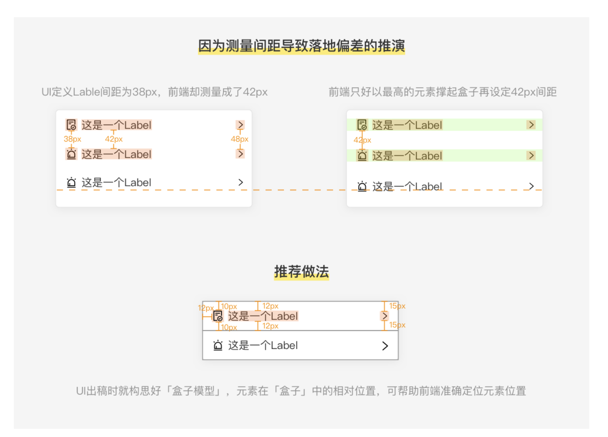 2. 應(yīng)用:如做表單時,UI 若不使用盒子,前端可能因測量間距方式不同(如 UI 以上一 Label 的 icon 距下一 Label 的 icon 定距,前端可能測文本間距)導(dǎo)致落地偏差,UI 出稿構(gòu)思盒子模型,可幫助前端準(zhǔn)確還原。