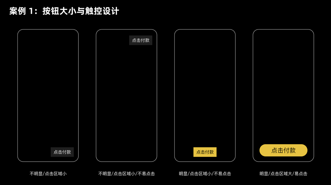 比如支付頁(yè)面的 “確認(rèn)付款” 按鈕,幾乎所有 APP 都會(huì)把它設(shè)計(jì)成頁(yè)面中最大、最醒目的元素,不僅尺寸足夠,還會(huì)放在拇指容易觸及的區(qū)域(如手機(jī)下半屏)。這樣一來(lái),用戶無(wú)需猶豫就能快速點(diǎn)擊,既減少誤操作風(fēng)險(xiǎn),也間接提升了支付轉(zhuǎn)化率。