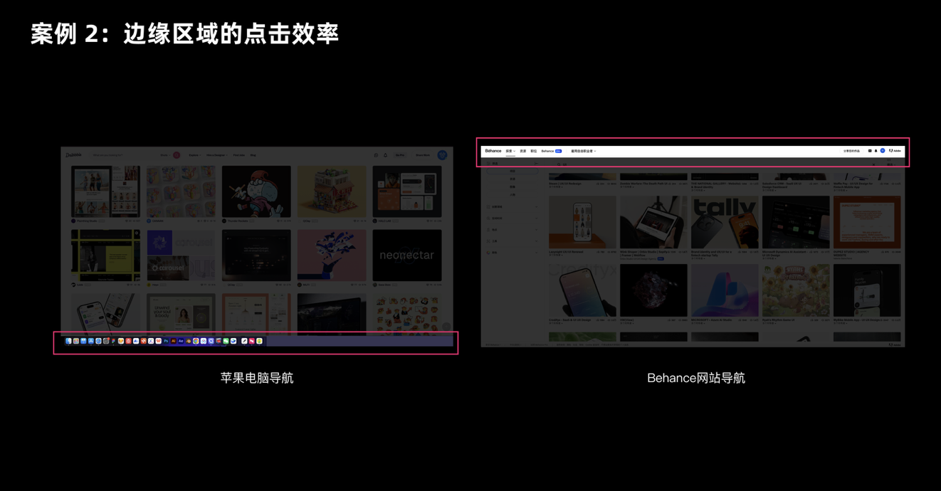 屏幕邊緣是被很多設(shè)計(jì)師忽略的 “黃金區(qū)域”—— 因?yàn)檫吘壞軗踝∈种富蚴髽?biāo)的移動(dòng),相當(dāng)于給目標(biāo)加了 “天然邊界”,用戶不用刻意控制精度就能快速定位。這就是為什么 Mac 的 Dock 欄、Windows 的任務(wù)欄都放在屏幕底部或側(cè)邊,而不是中間。